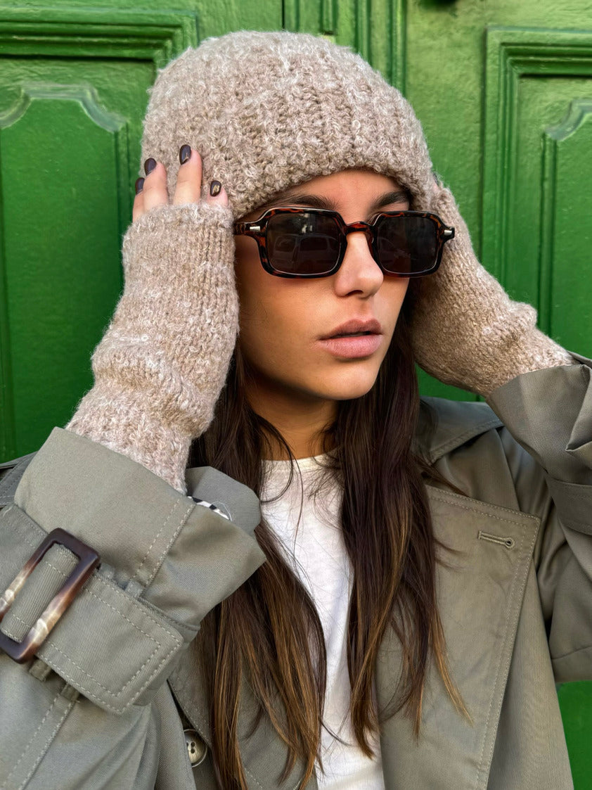 Combo bonnet et mitaines beige, confortables et chaudes, idéales pour compléter un look d'hiver. Confectionnés en 100% acrylique, ces accessoires vous apporteront douceur et chaleur tout en ajoutant une touche élégante à votre tenue hivernale.
