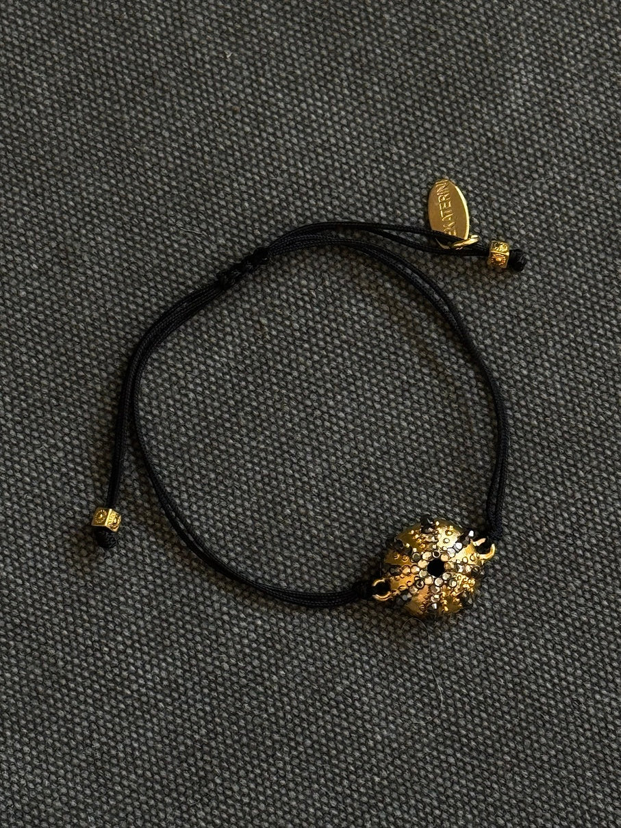 Bracelet sur cordon noir ajustable avec pendentif en plaqué or, orné de strass étincelants. Un bijou élégant et raffiné, parfait pour toutes les occasions.