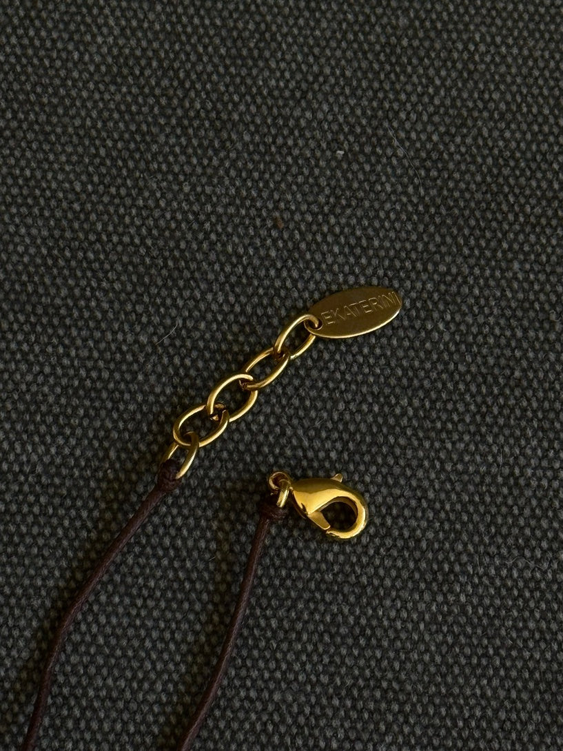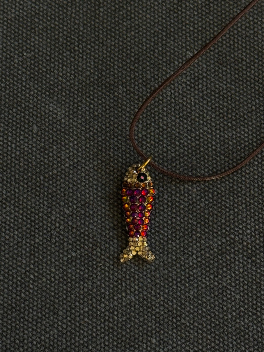 Ce pendentif poisson plaqué or, orné de strass rose, est suspendu à un cordon fin marron. Un bijou simple et élégant pour compléter vos tenues.