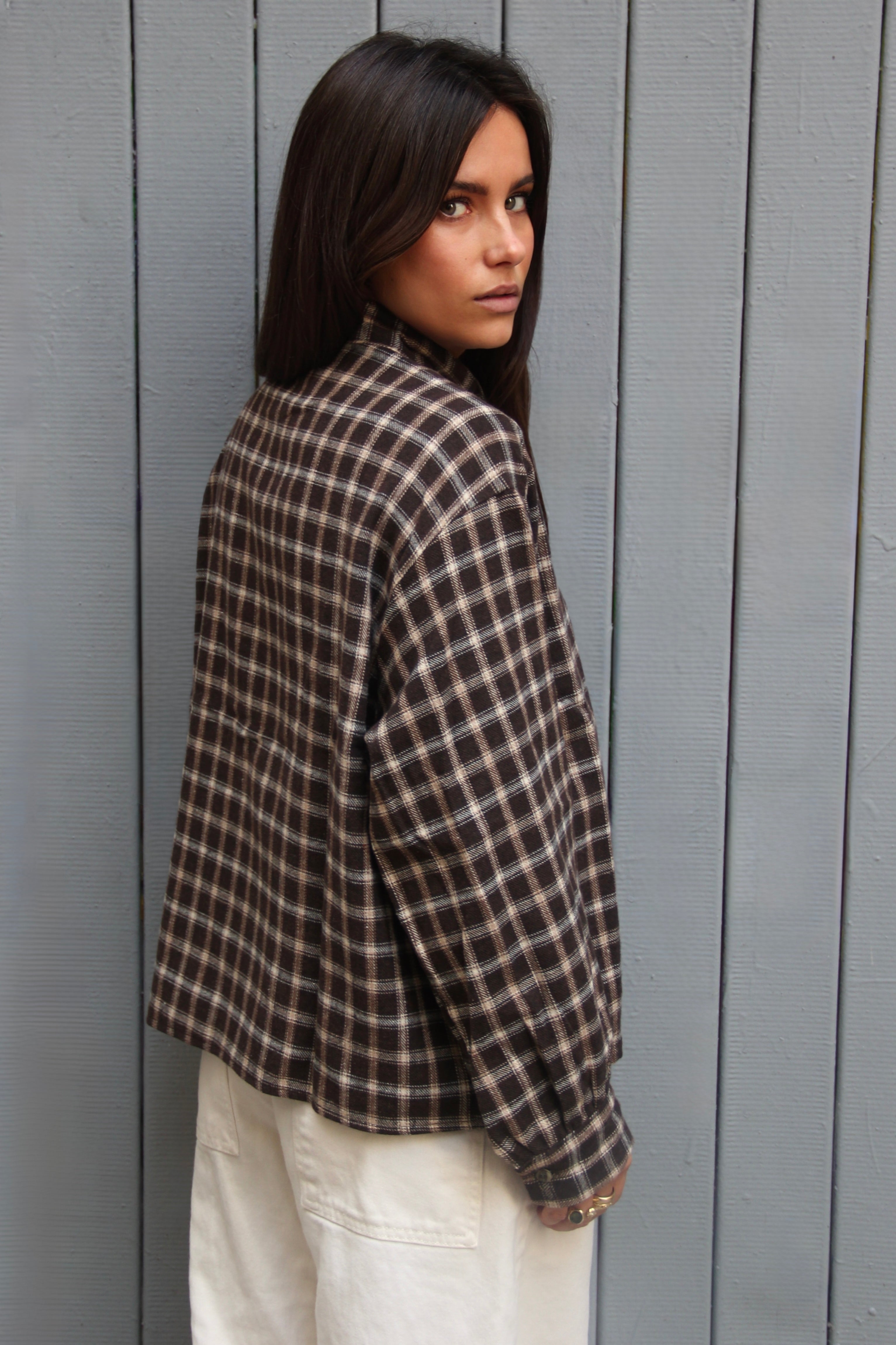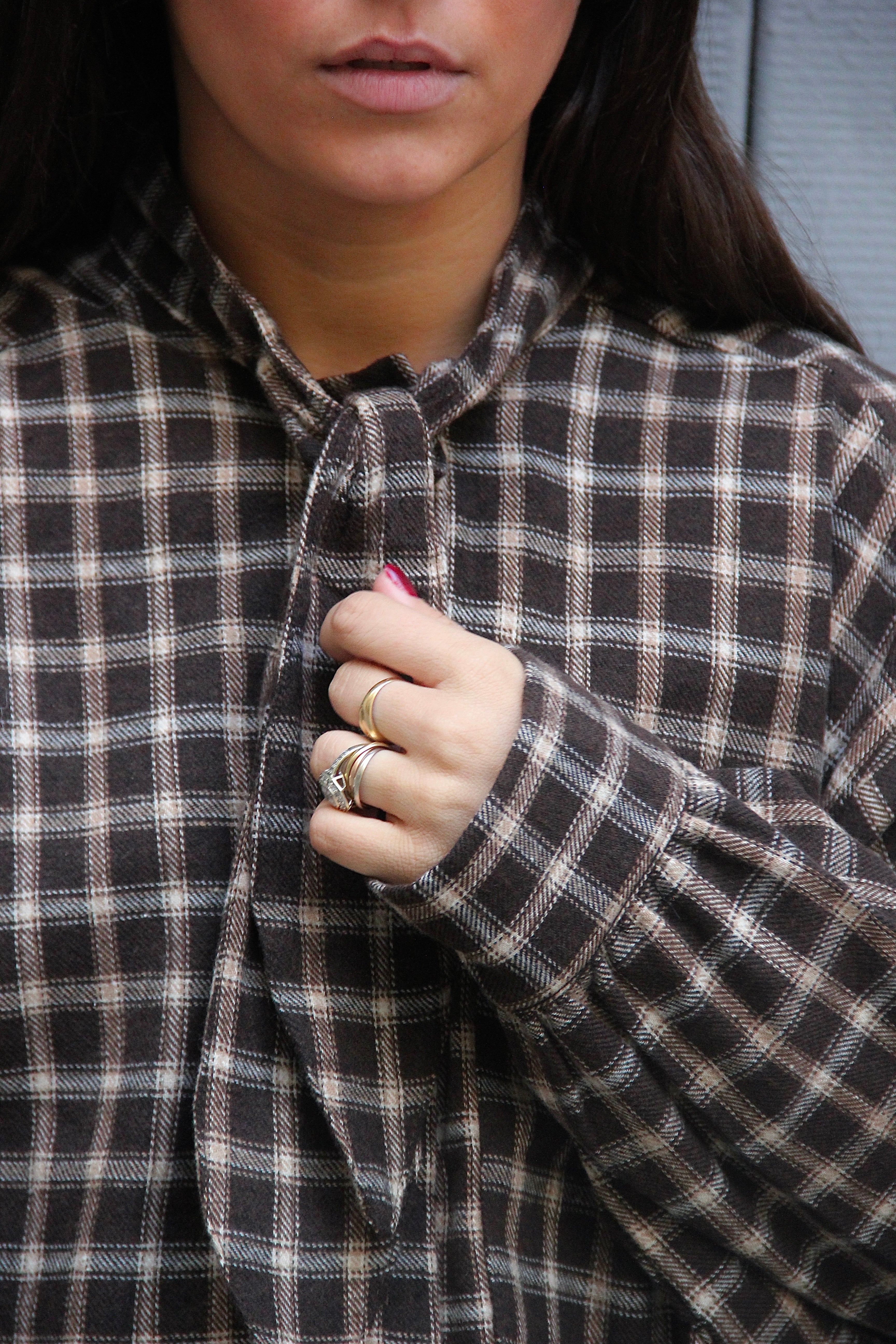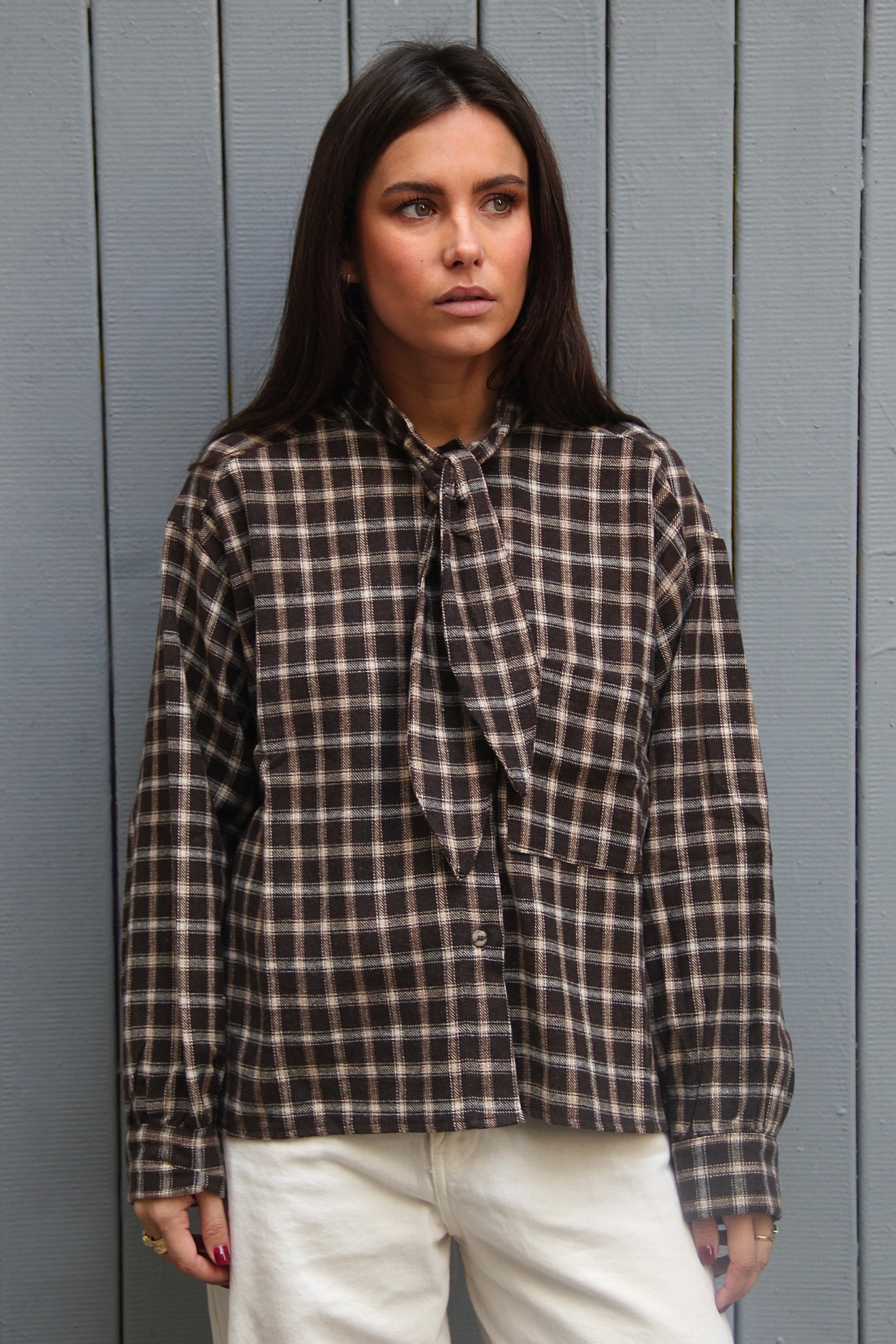 Chemise à carreaux épaisse et douce, au tomber fluide. Détail lavallière pour un style à la fois élégant et casual. Taille unique. Le mannequin mesure 1m63.