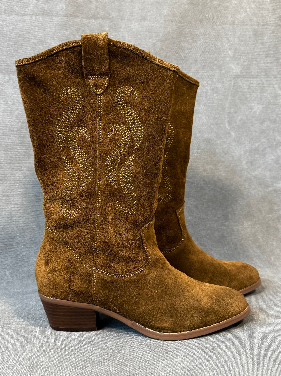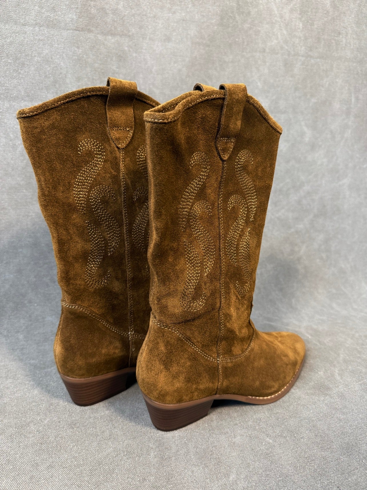 Découvrez nos bottes western élégantes en daim camel, ornées de surpiqûres en forme d’arabesques pour une touche raffinée. Leur talon bas et large assure un confort optimal, idéal pour une utilisation quotidienne.