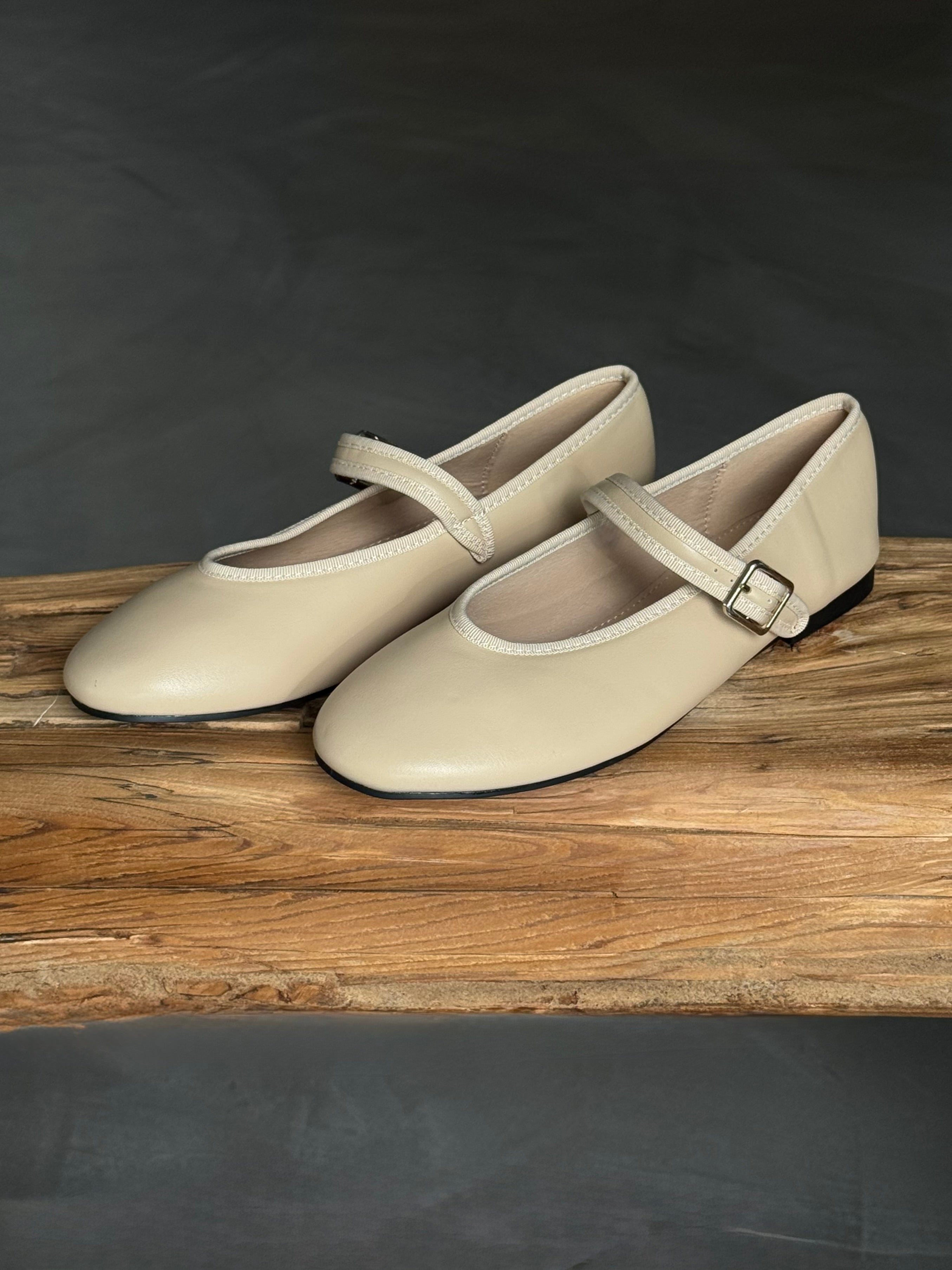 Ballerines à bride en simili cuir beige, élégantes et confortables. Leur bride ajustable avec boucle assure un maintien parfait, tandis que leur design épuré s’associe facilement à toutes vos tenues, du jean décontracté à la robe chic.