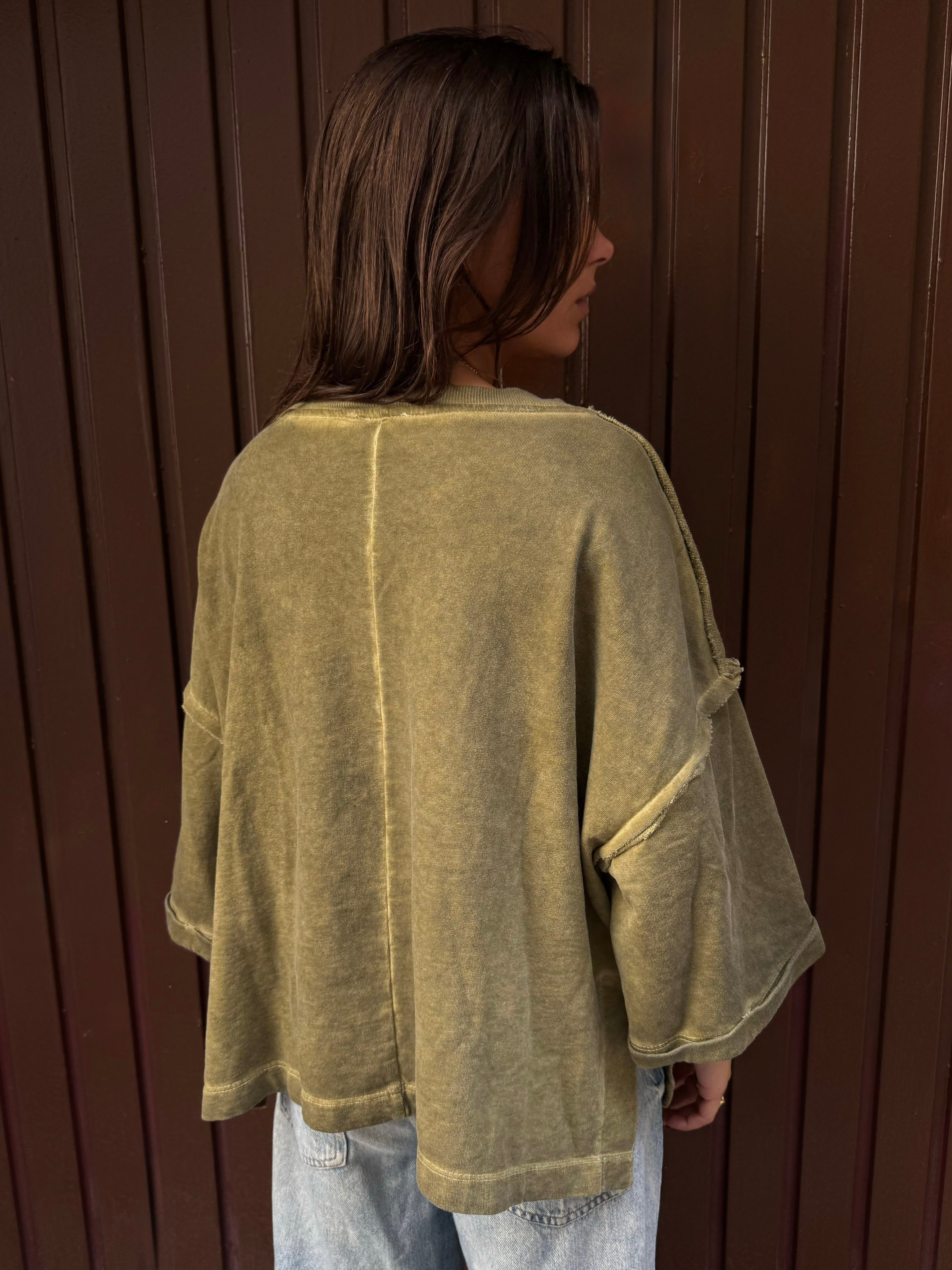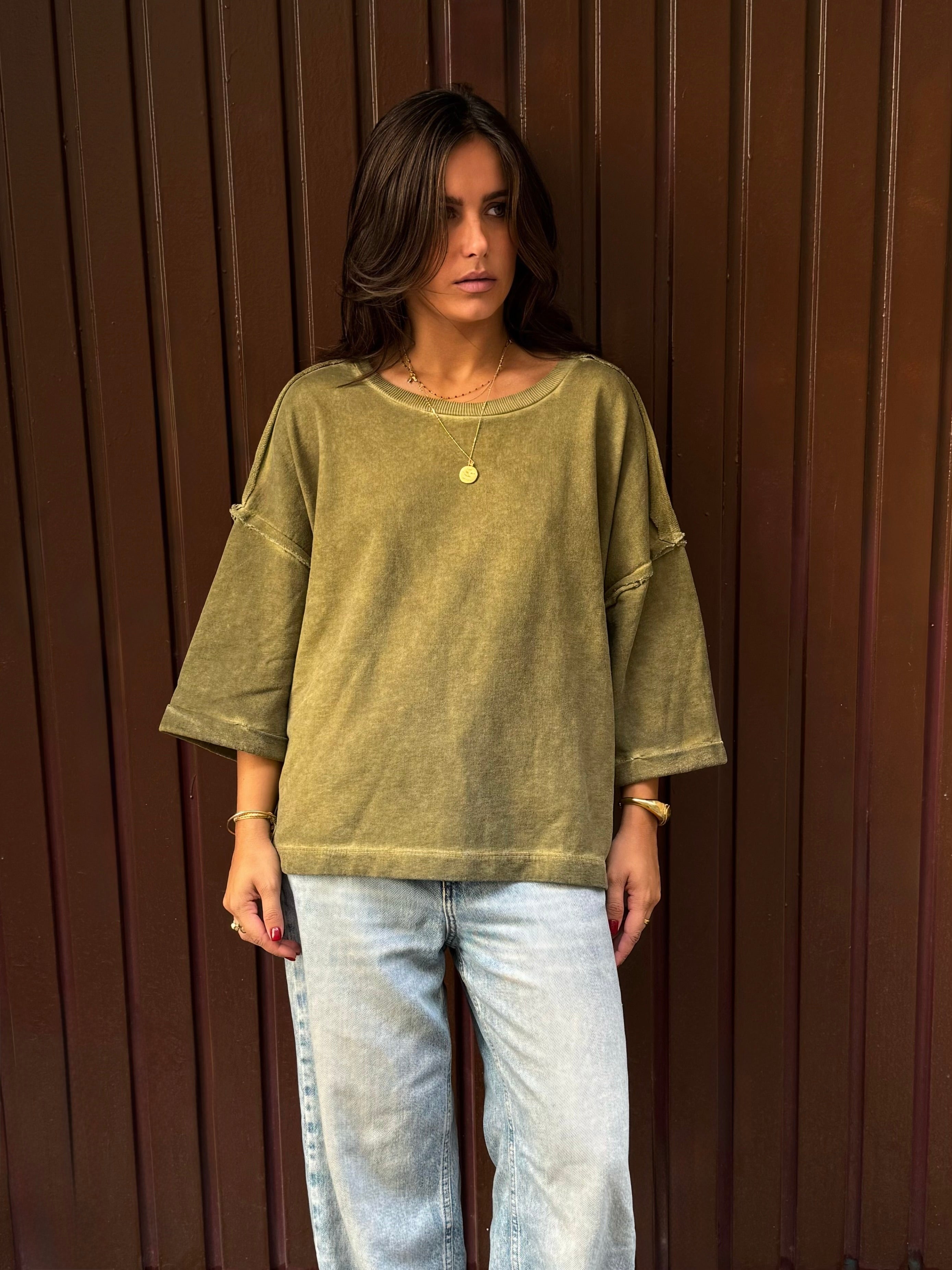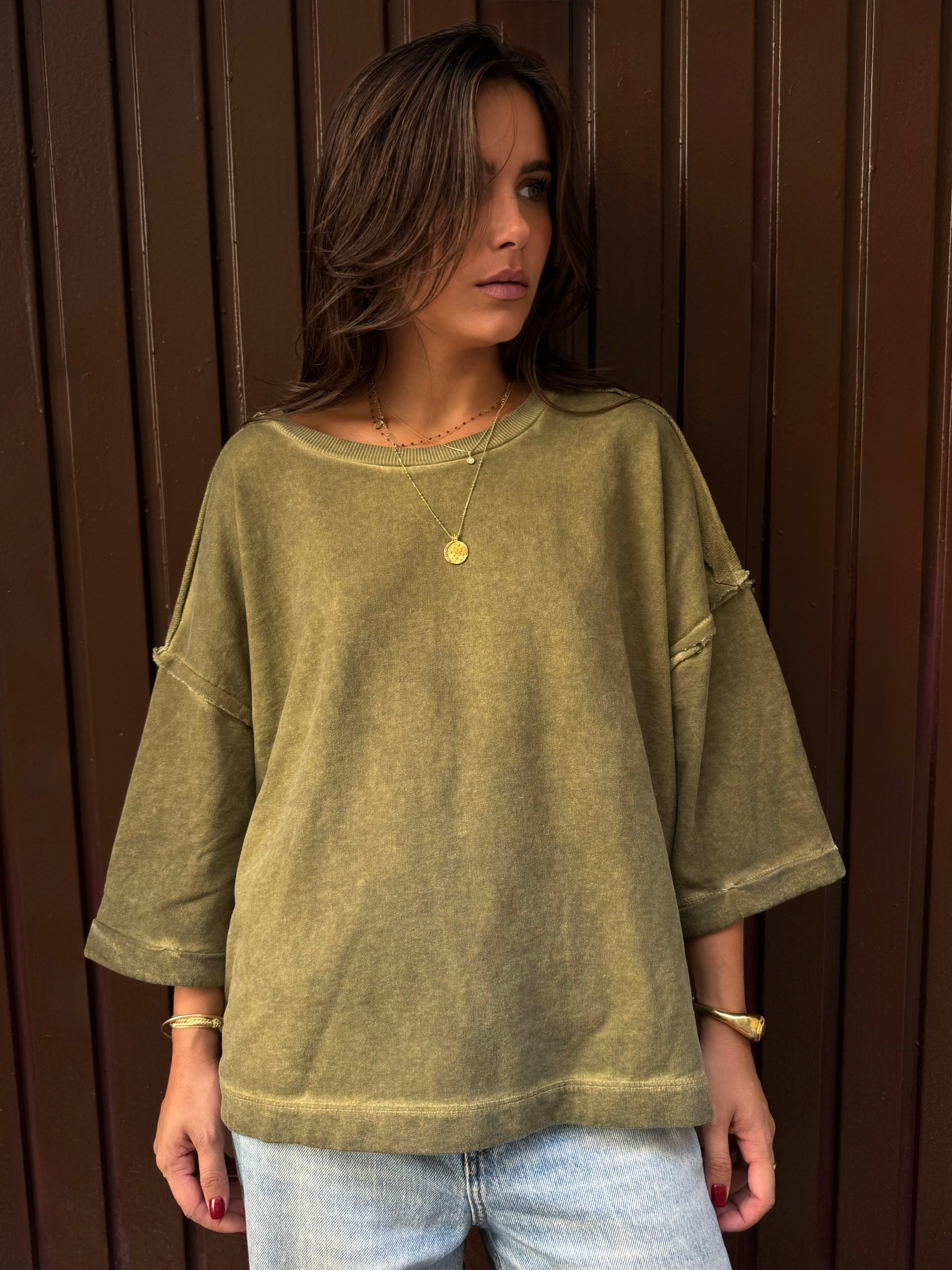 Ce haut oversize en 100% coton séduit par sa coupe ample et ses manches 3/4 au style décontracté. Sa teinte kaki délavé et sa matière douce offrent confort et allure tendance, parfaits pour un look casual chic au quotidien. Taille unique. Le mannequin mesure 1m63.