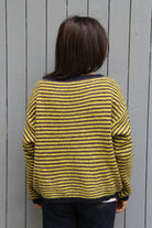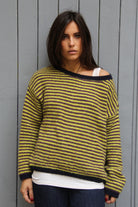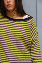 Pull oversize à rayures anis et violet rehaussées de bleu marine, tricoté dans une maille douce et confortable composée de 8% laine, 8% viscose, 14% polyamide, 10% polyester et 60% acrylique. Sa coupe ample et son encolure légèrement dégagée en font une pièce tendance et facile à porter. Le mannequin mesure 1m63.