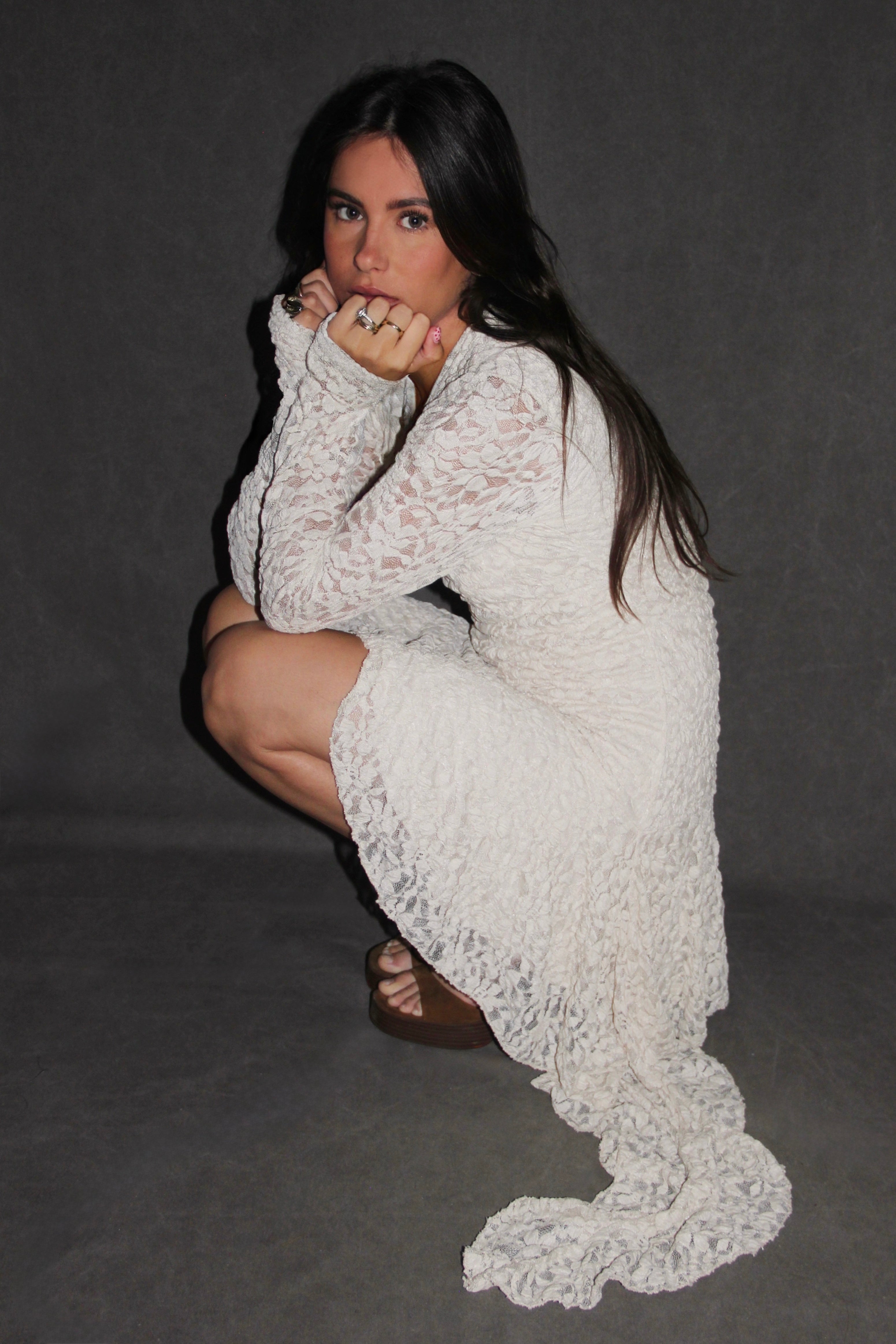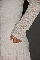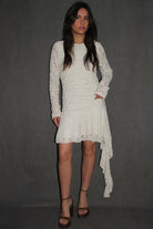 Robe courte écrue en dentelle avec manches longues et coupe près du corps. Bas asymétrique avec volant et longueur prolongée sur le côté. Matière élastique, qui s’adapte facilement à la silhouette. Taille unique. Le mannequin mesure 1m65.