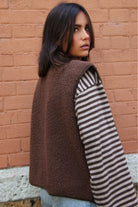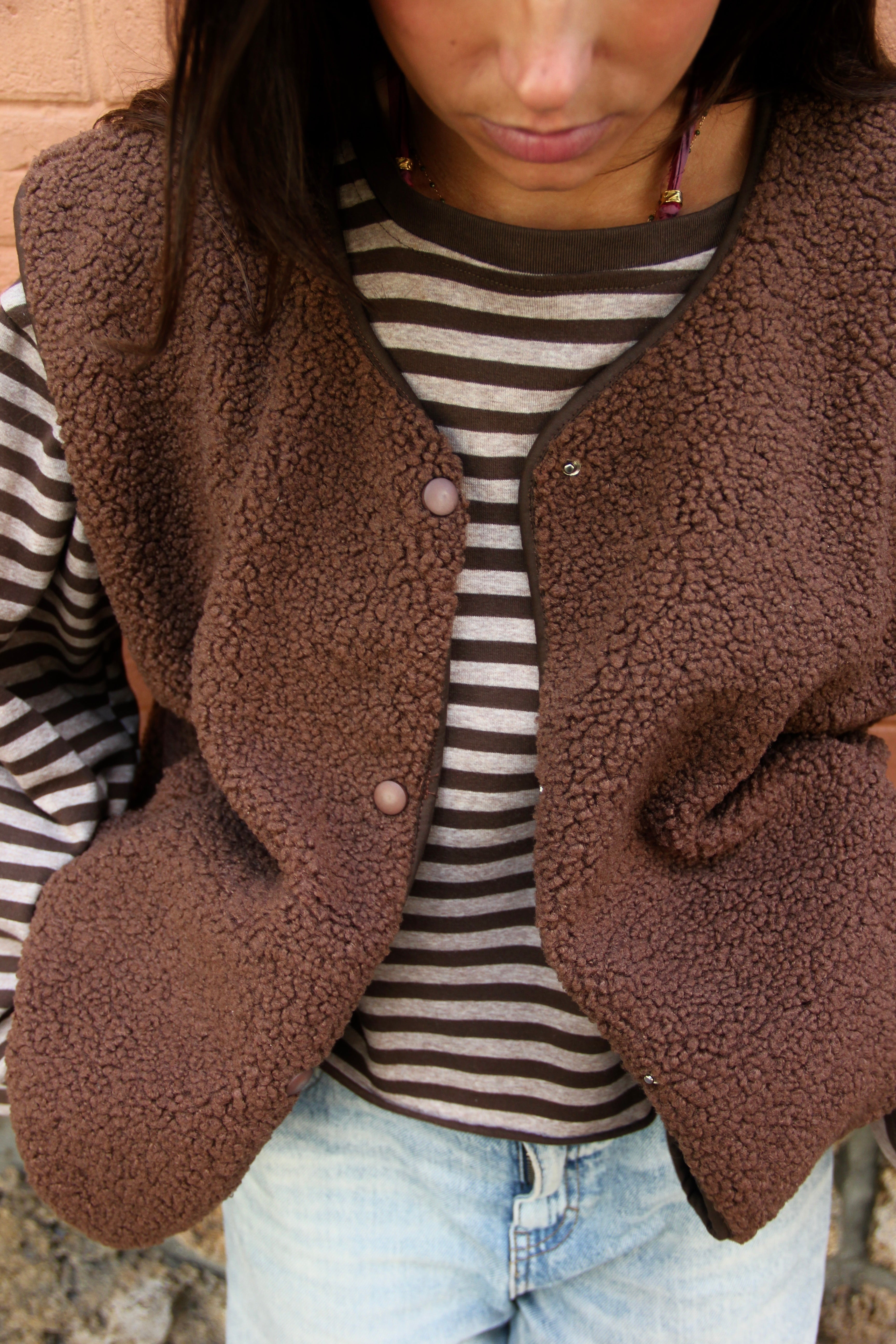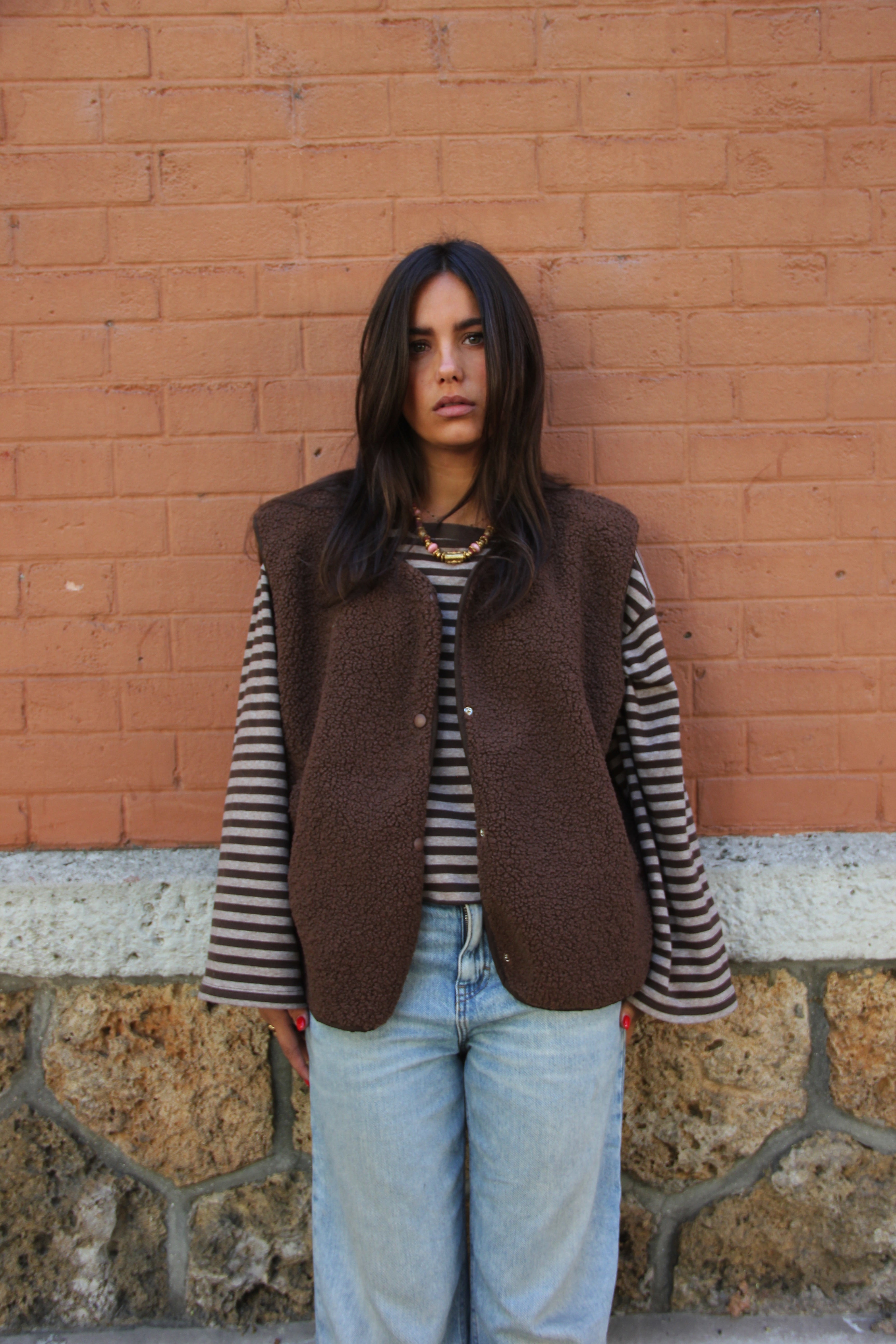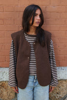 Veste sans manches en sherpa marron, douce et chaude, au toucher bouclette. Coupe droite et ample pour un confort optimal, finition gansée ton sur ton et fermeture à pressions discrètes. Dotée de poches pratiques. Taille unique. Le mannequin mesure 1m70.