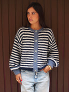 Ce gilet rayé bleu et écru séduit par sa coupe légèrement oversize et ses boutons contrastants. Fabriqué en Italie dans un mélange doux et chaud (59% polyester recyclé, 21% polyamide, 11% polyester, 8% laine, 1% élasthanne). Parfait pour réchauffer vos tenues avec une touche cosy et tendance. Taille unique. Le mannequin mesure 1m63.