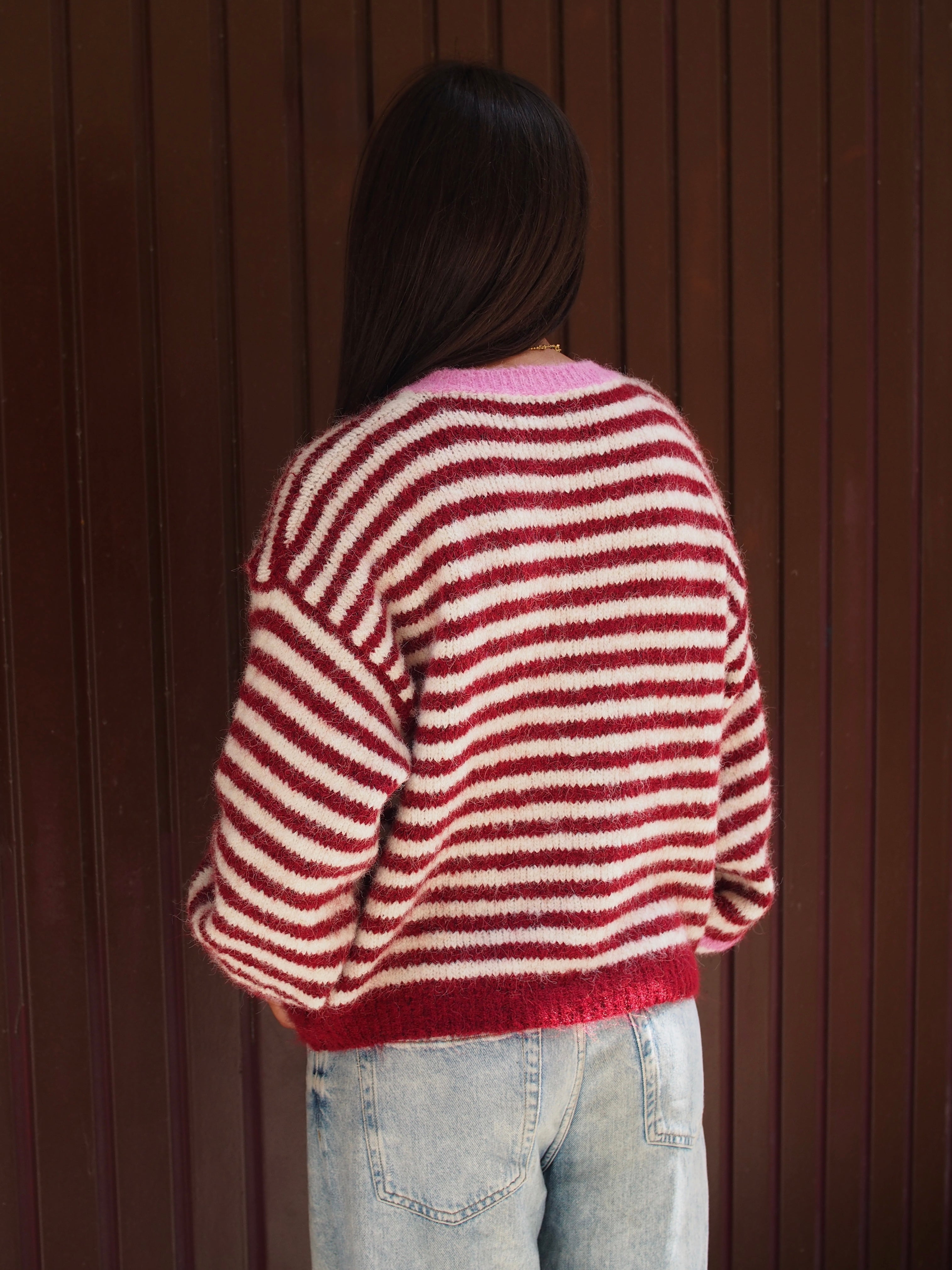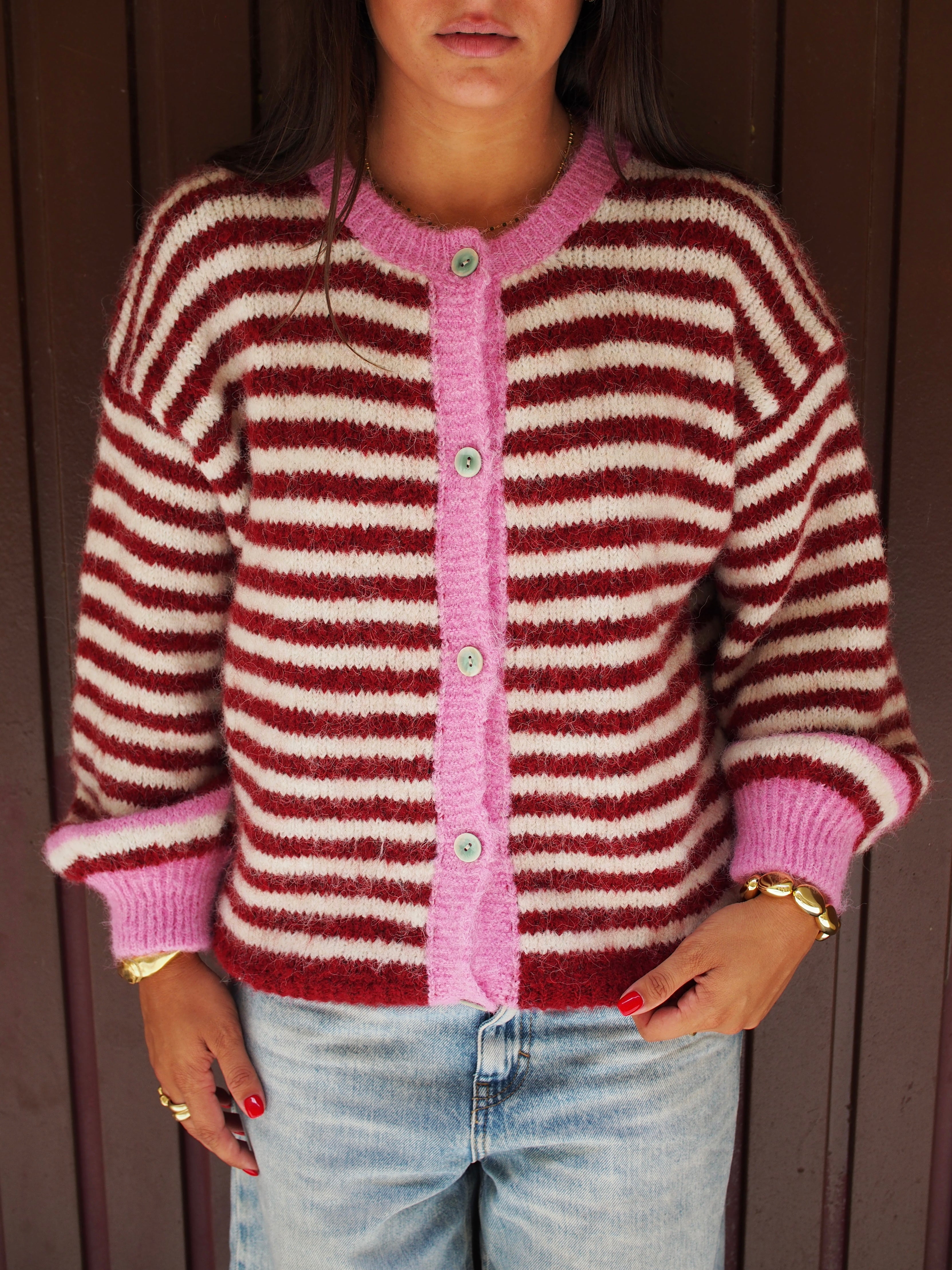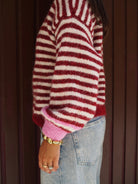 Ce gilet rayé bordeaux et écru séduit par sa coupe légèrement oversize et ses boutons contrastants. Fabriqué en Italie dans un mélange doux et chaud (59% polyester recyclé, 21% polyamide, 11% polyester, 8% laine, 1% élasthanne). Parfait pour réchauffer vos tenues avec une touche cosy et tendance. Taille unique. Le mannequin mesure 1m63.