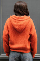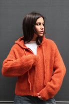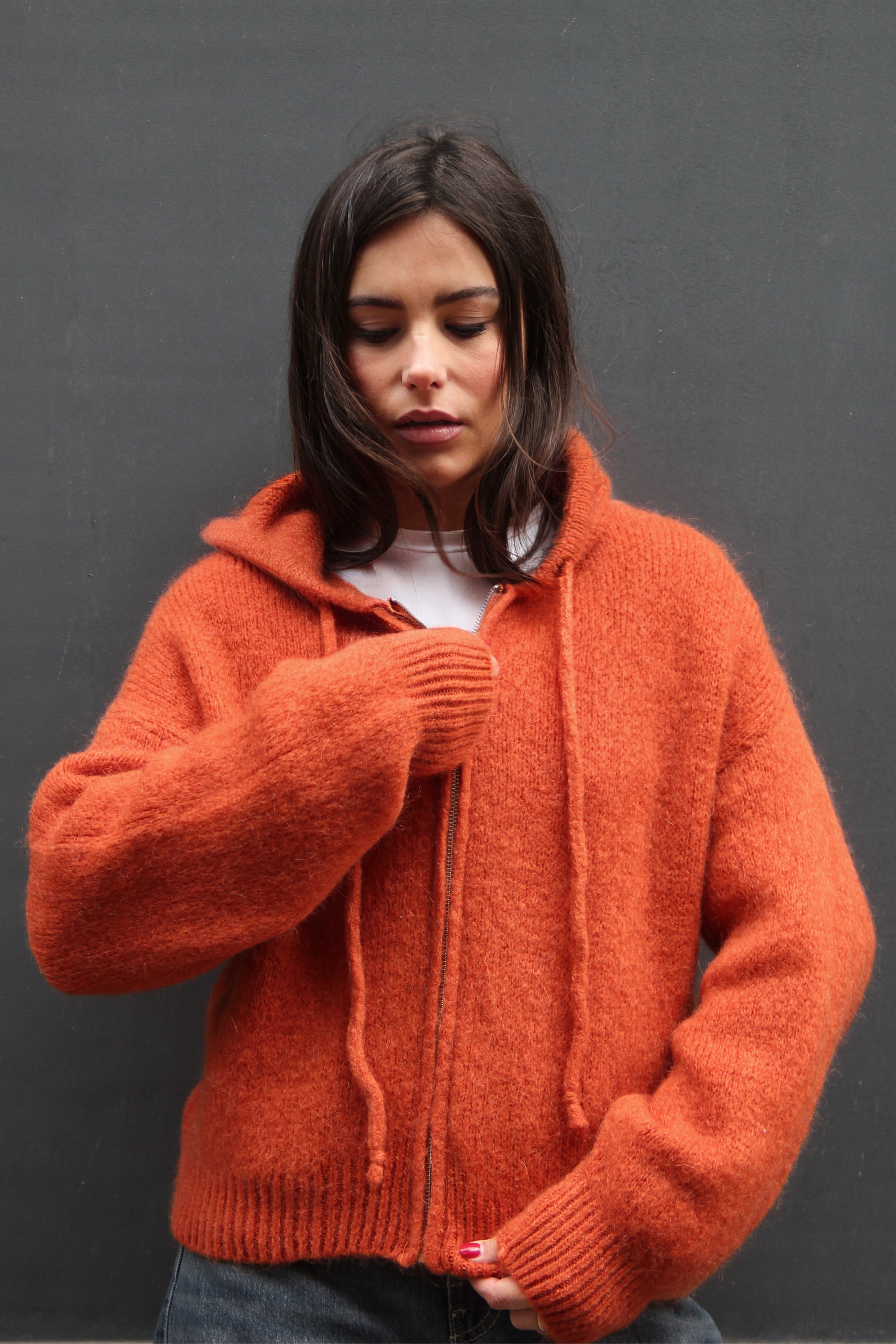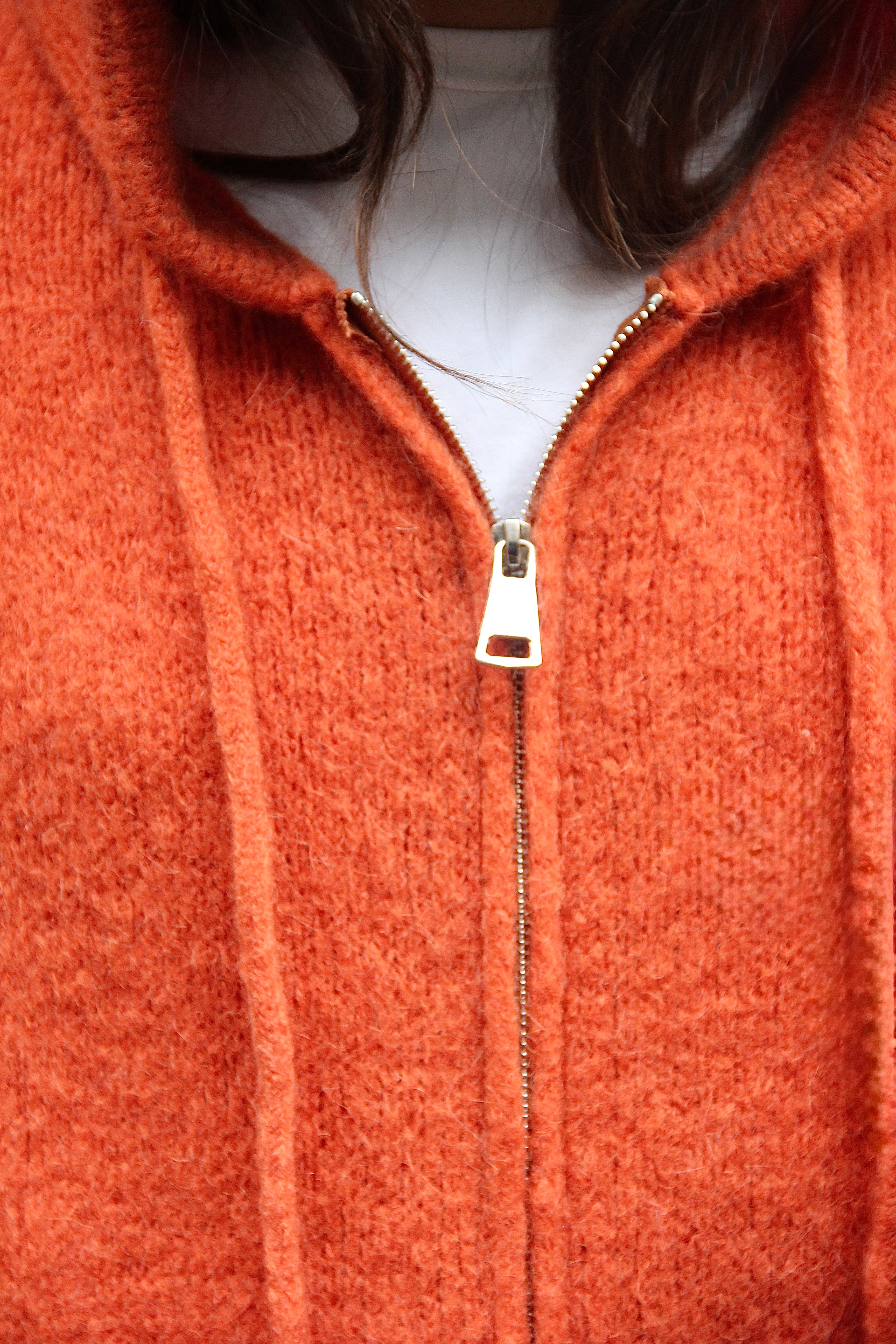 Gilet zippé à capuche en maille douce, coupe légèrement ample, manches longues, finitions bord-côte. Taille unique. Le mannequin mesure 1m65.