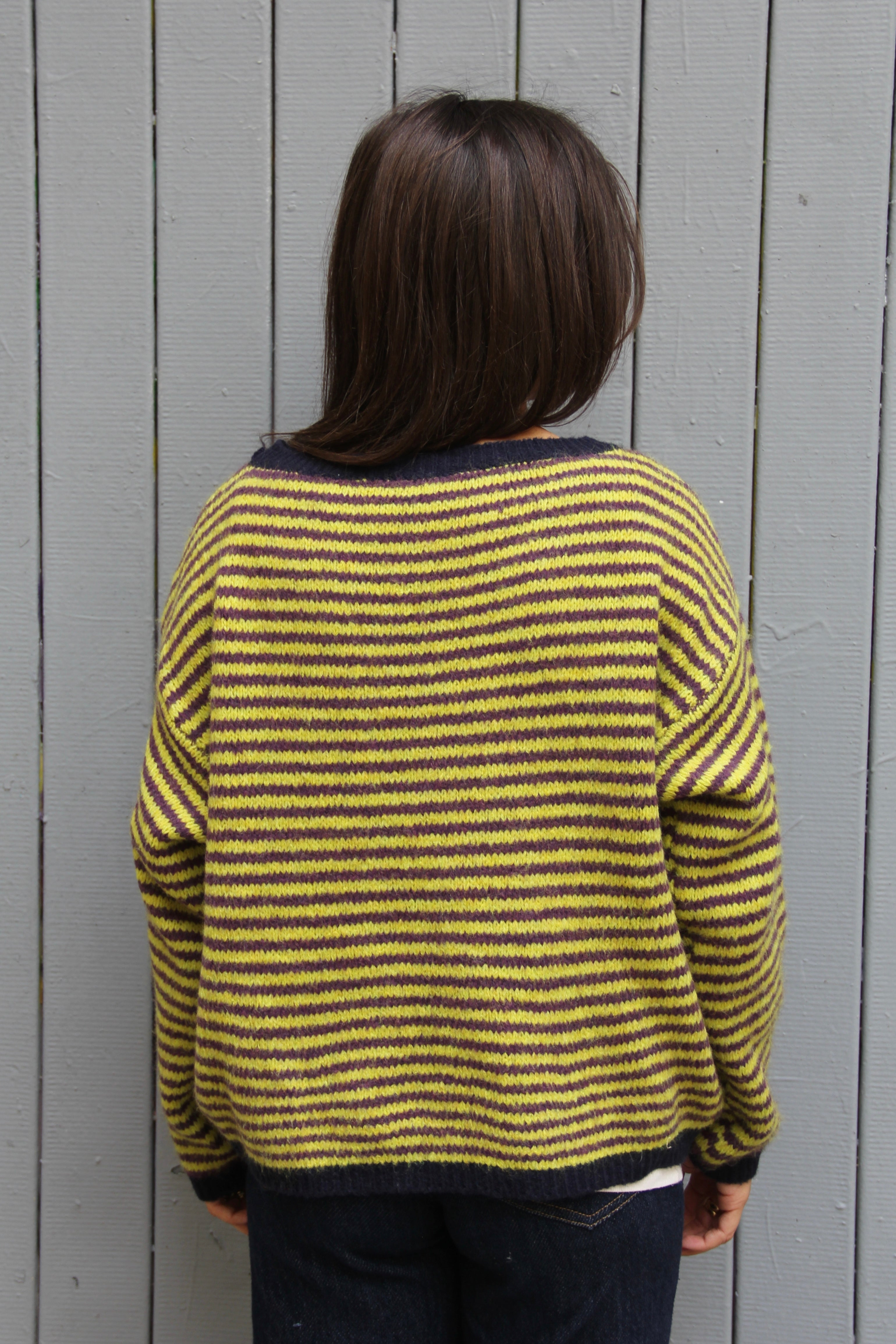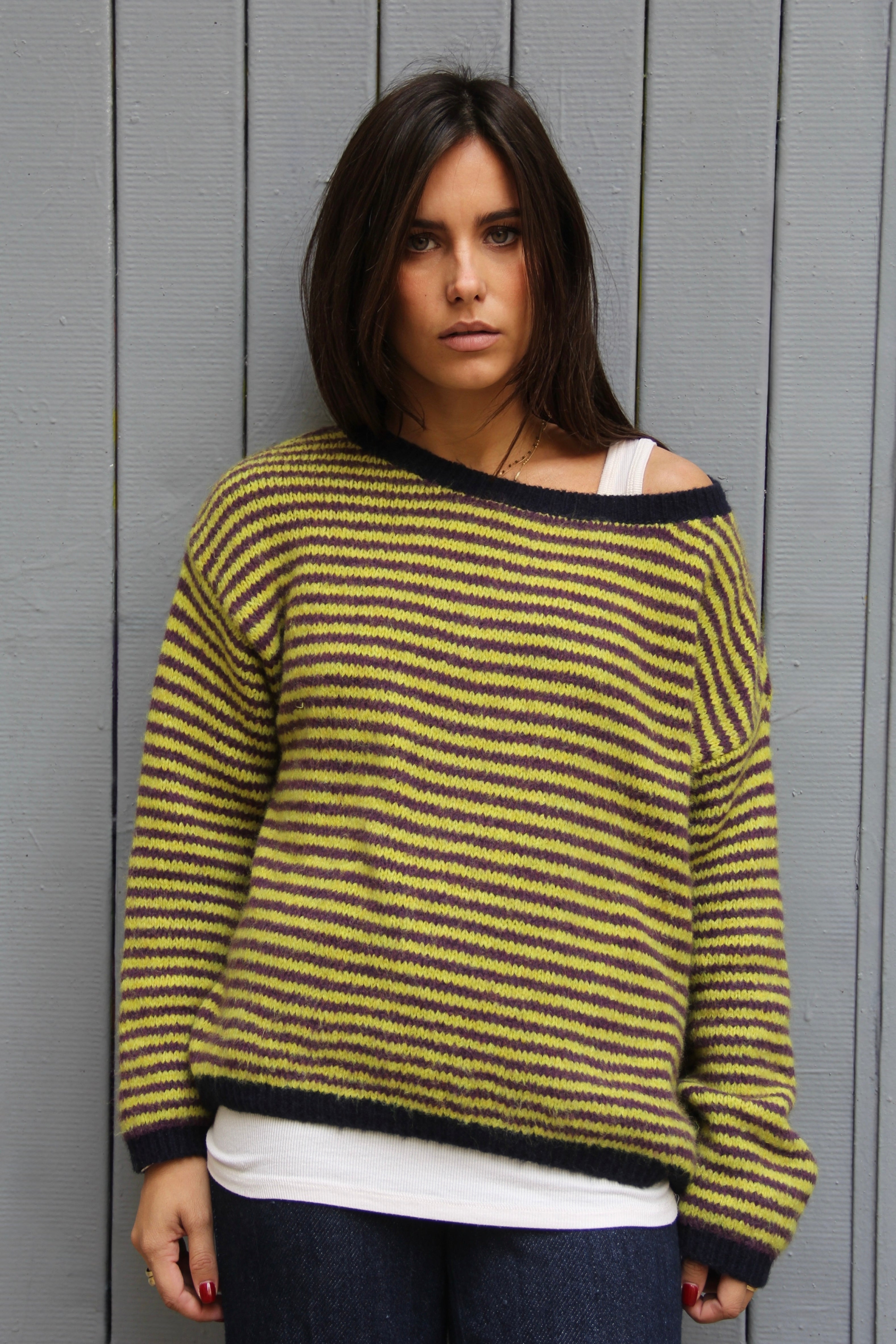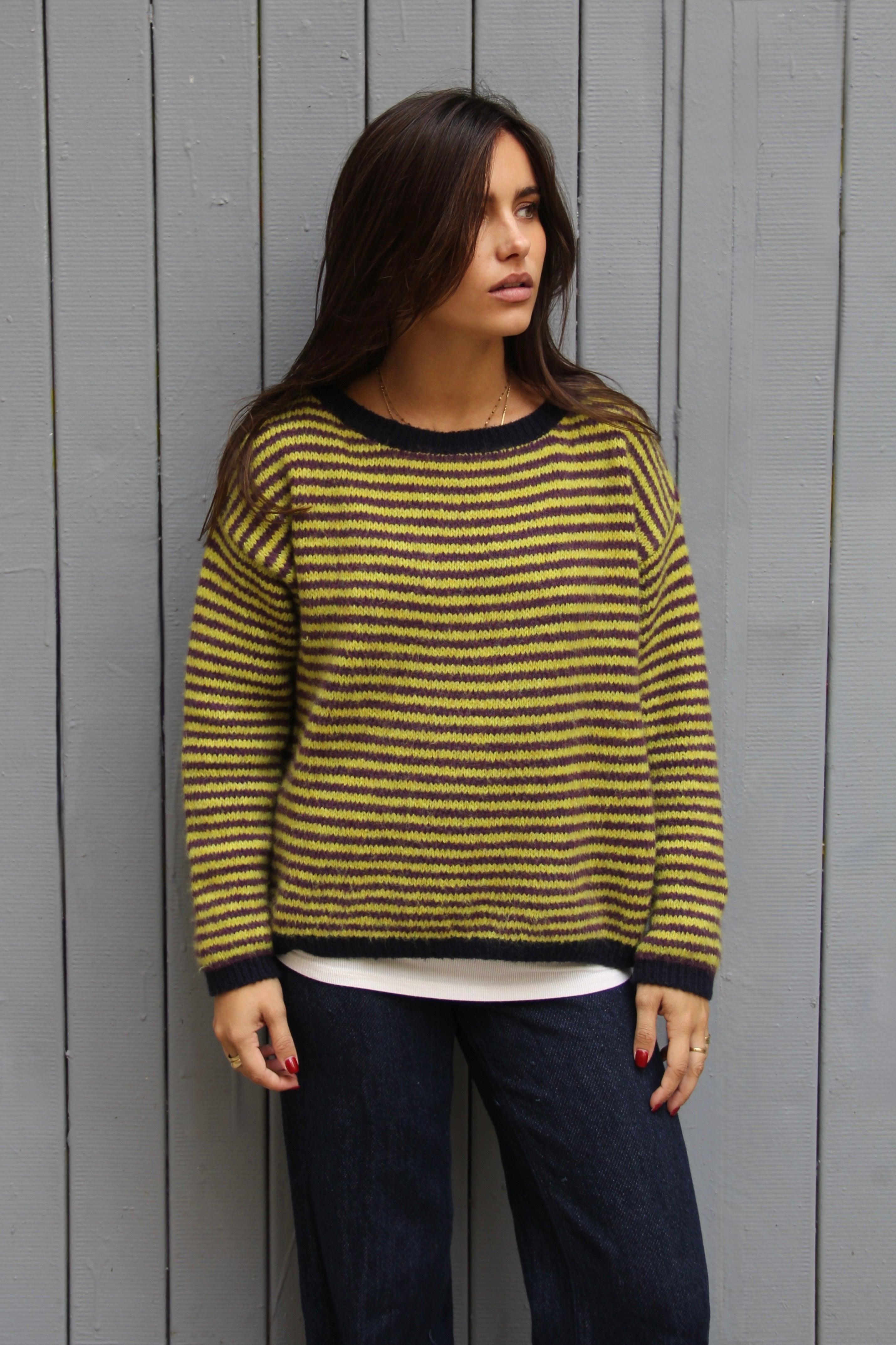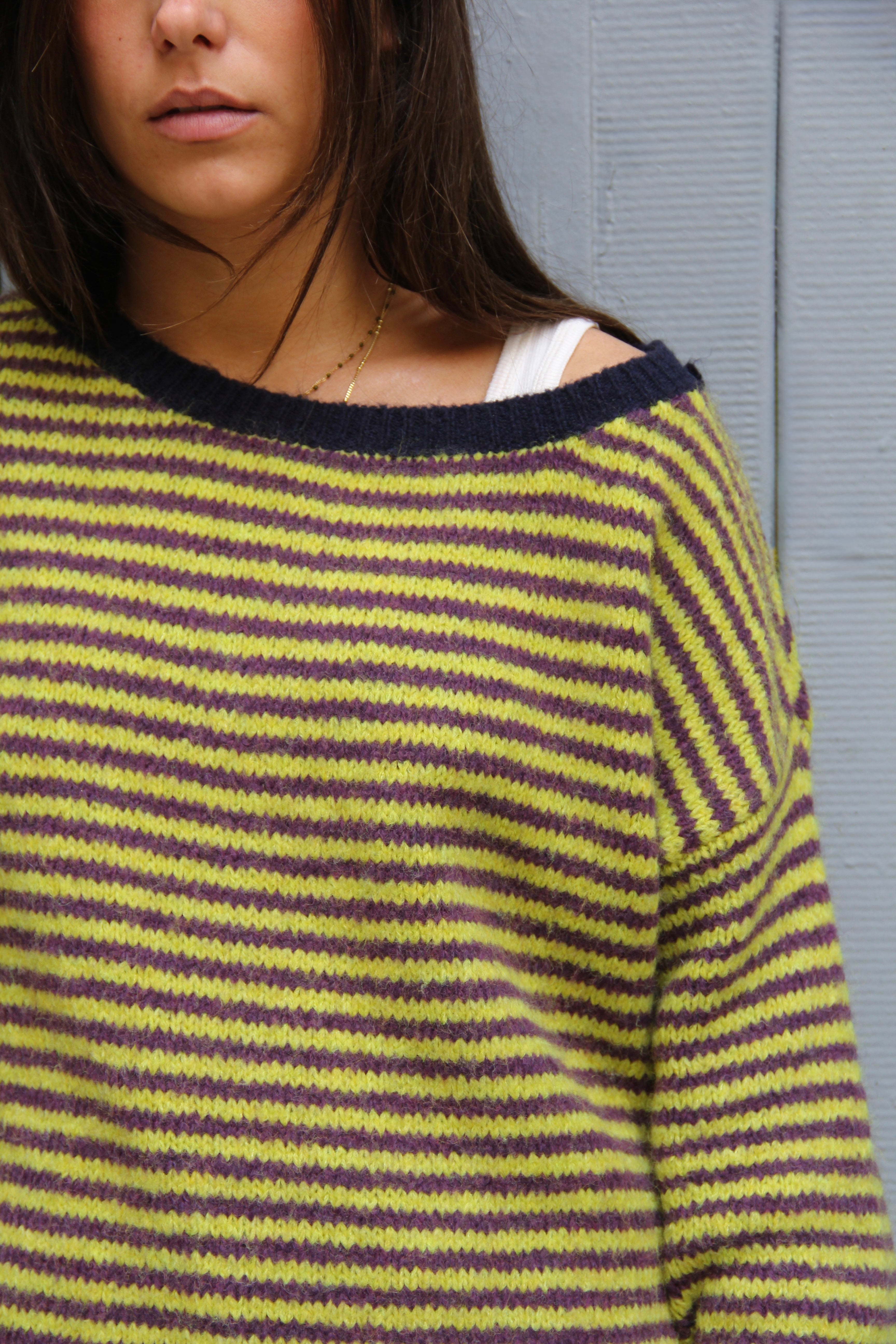 Pull oversize à rayures anis et violet rehaussées de bleu marine, tricoté dans une maille douce et confortable composée de 8% laine, 8% viscose, 14% polyamide, 10% polyester et 60% acrylique. Taille unique. Le mannequin mesure 1m63.