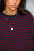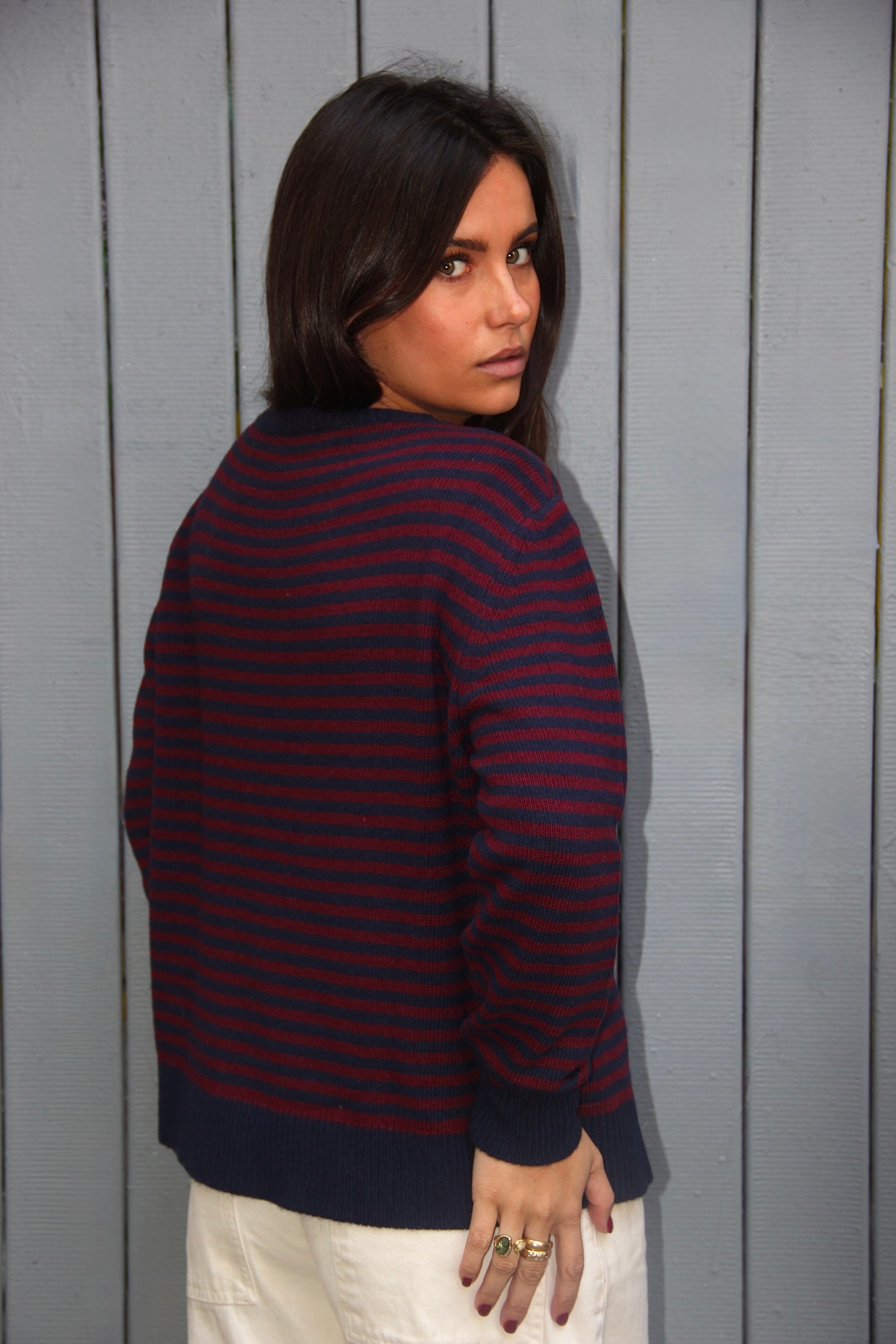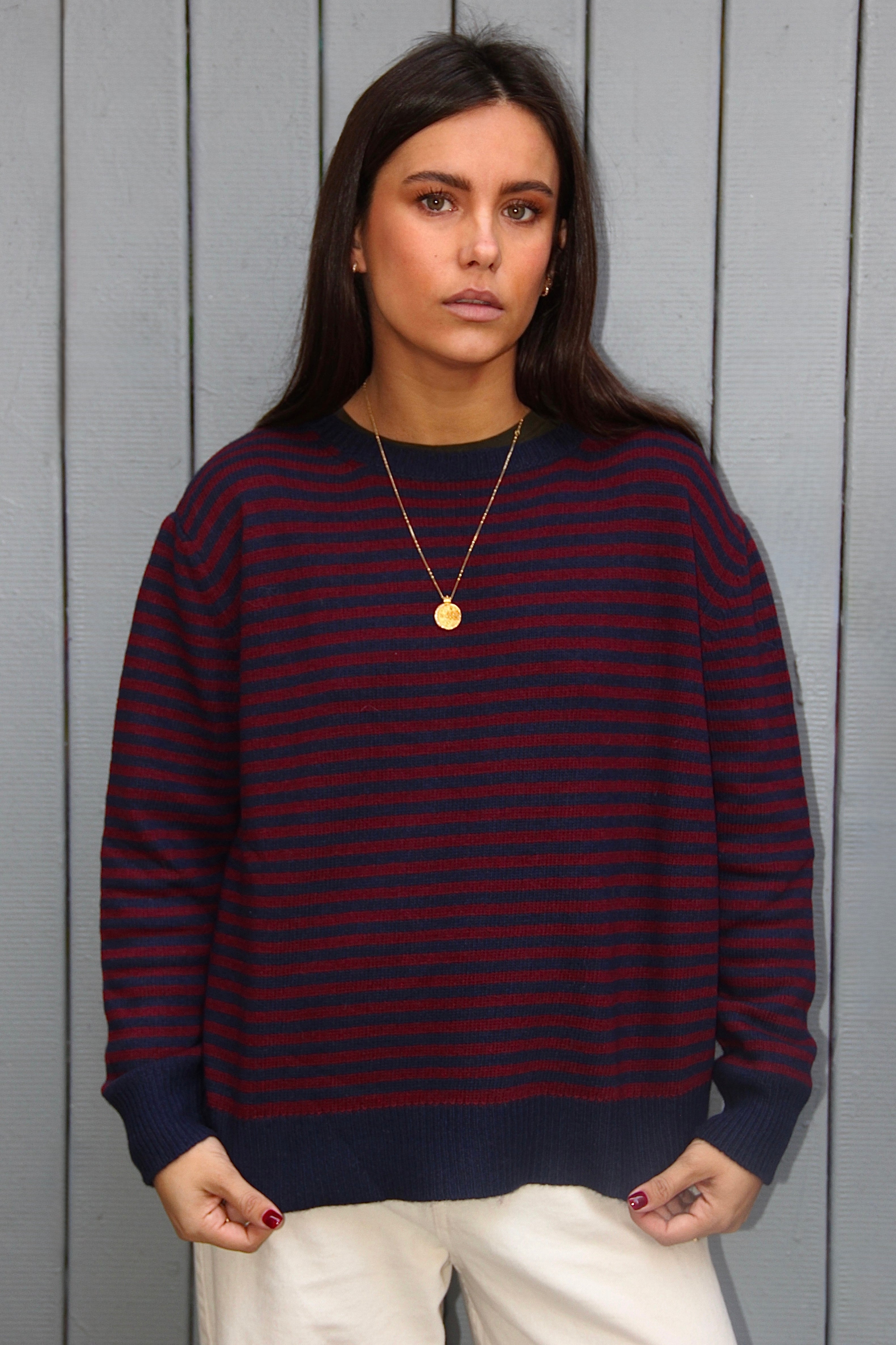 Pull rayé bleu marine et rouge, doux et chaud, à la coupe droite et col rond. Un essentiel confortable et élégant pour la saison. Taille unique. Le mannequin mesure 1m63.