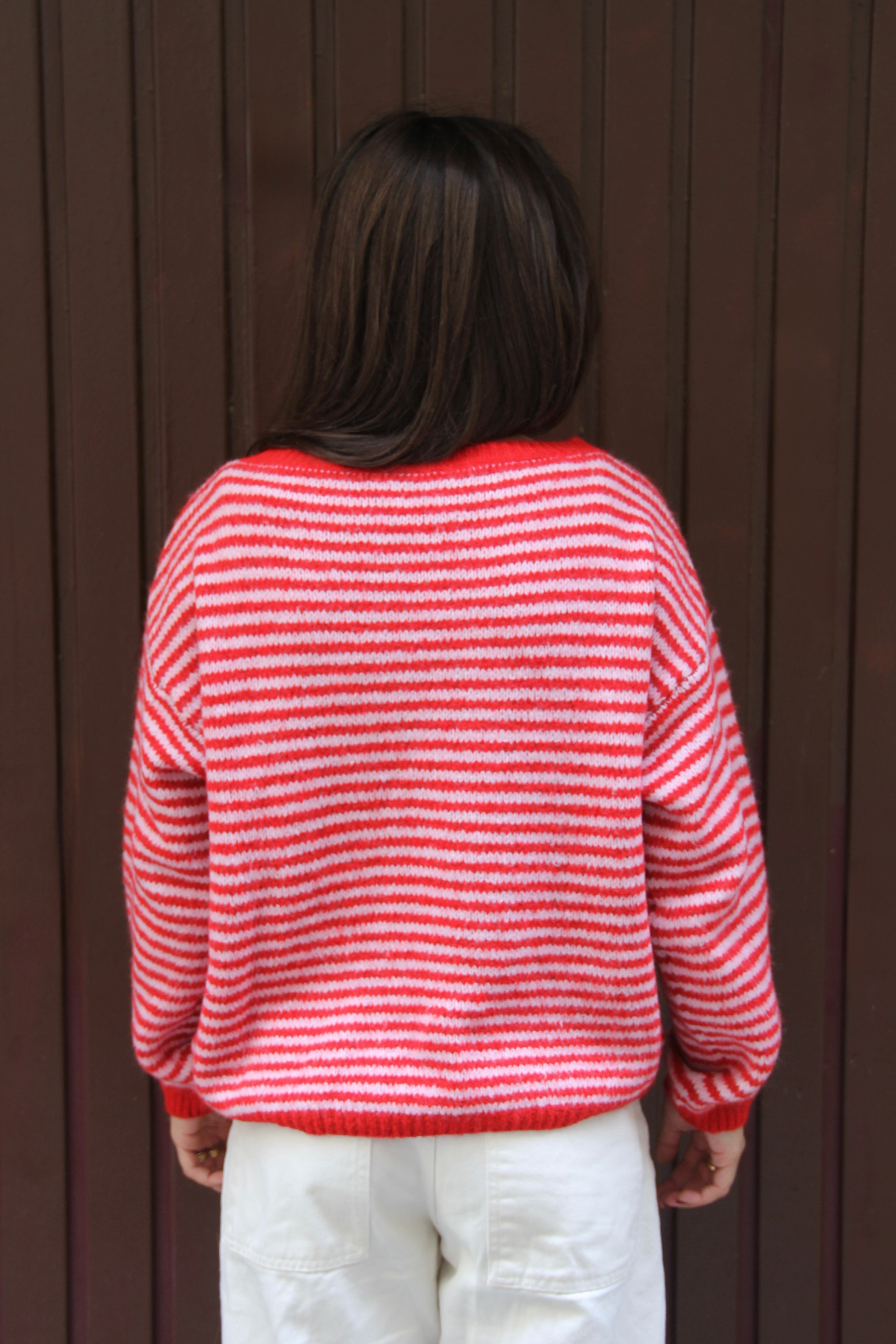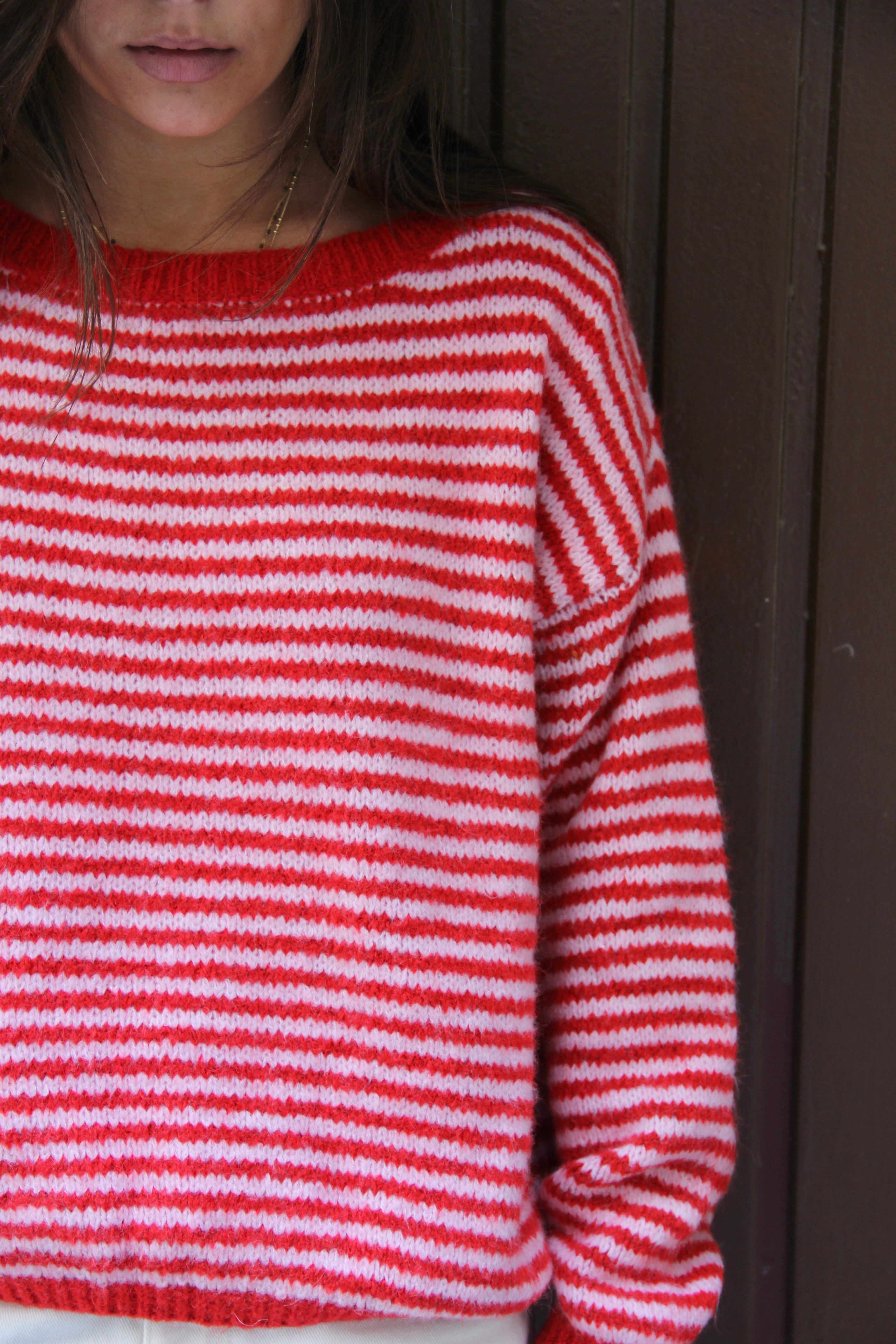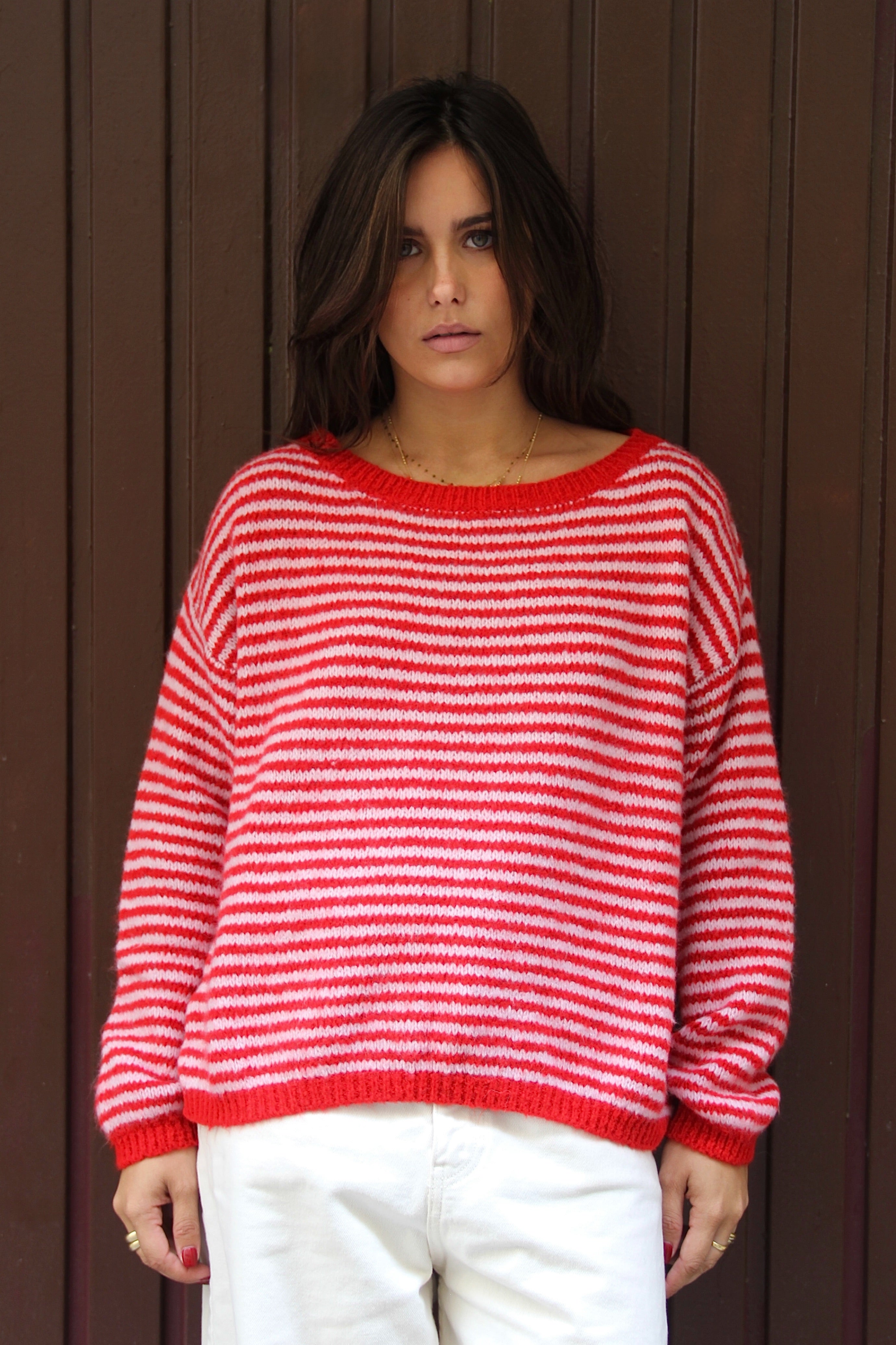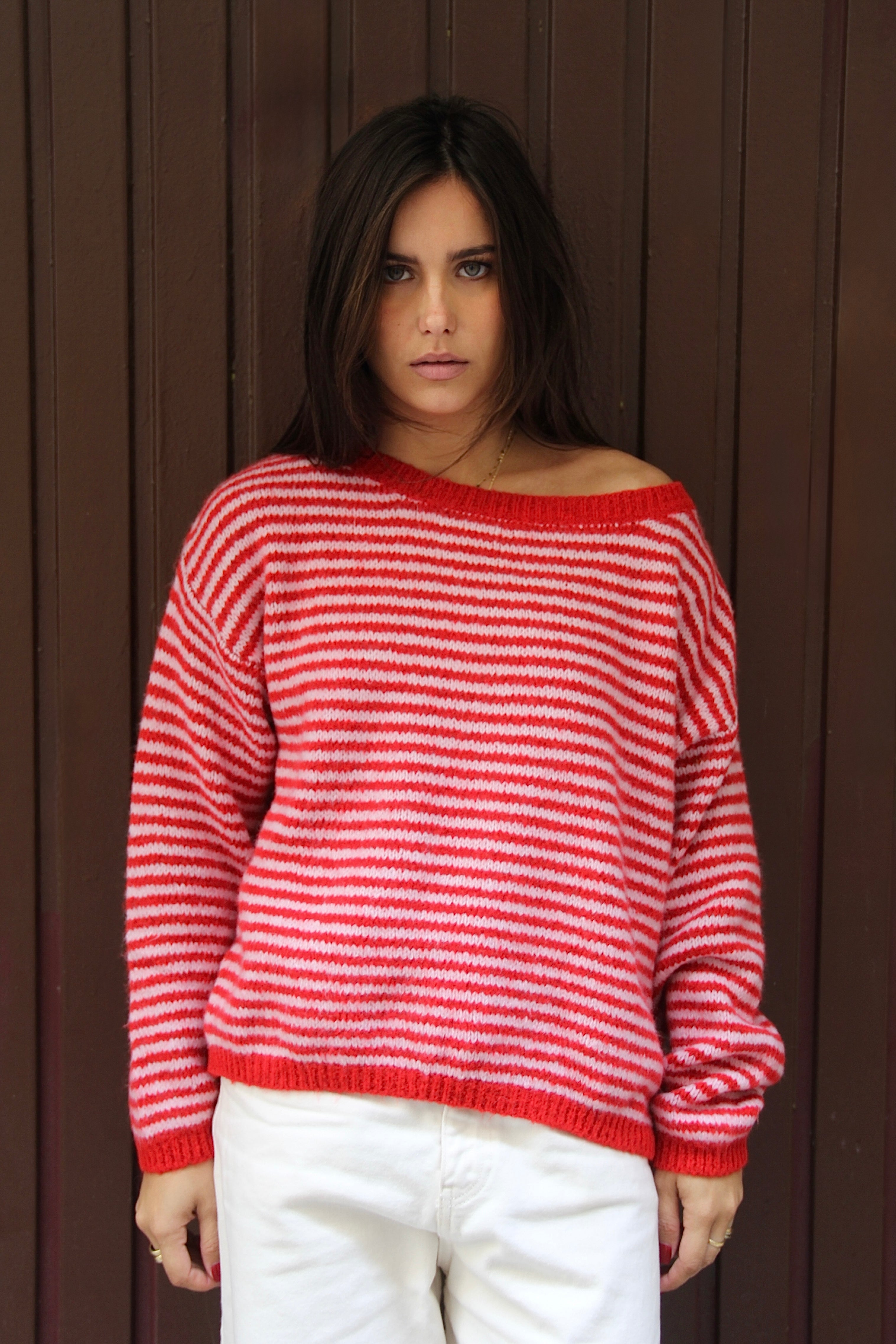 Pull oversize à rayures rose et rouge, tricoté dans une maille douce et confortable composée de 8% laine, 8% viscose, 14% polyamide, 10% polyester et 60% acrylique. Sa coupe ample et son encolure légèrement dégagée en font une pièce tendance et facile à porter, idéale pour un look décontracté et moderne. Le mannequin mesure 1m63.