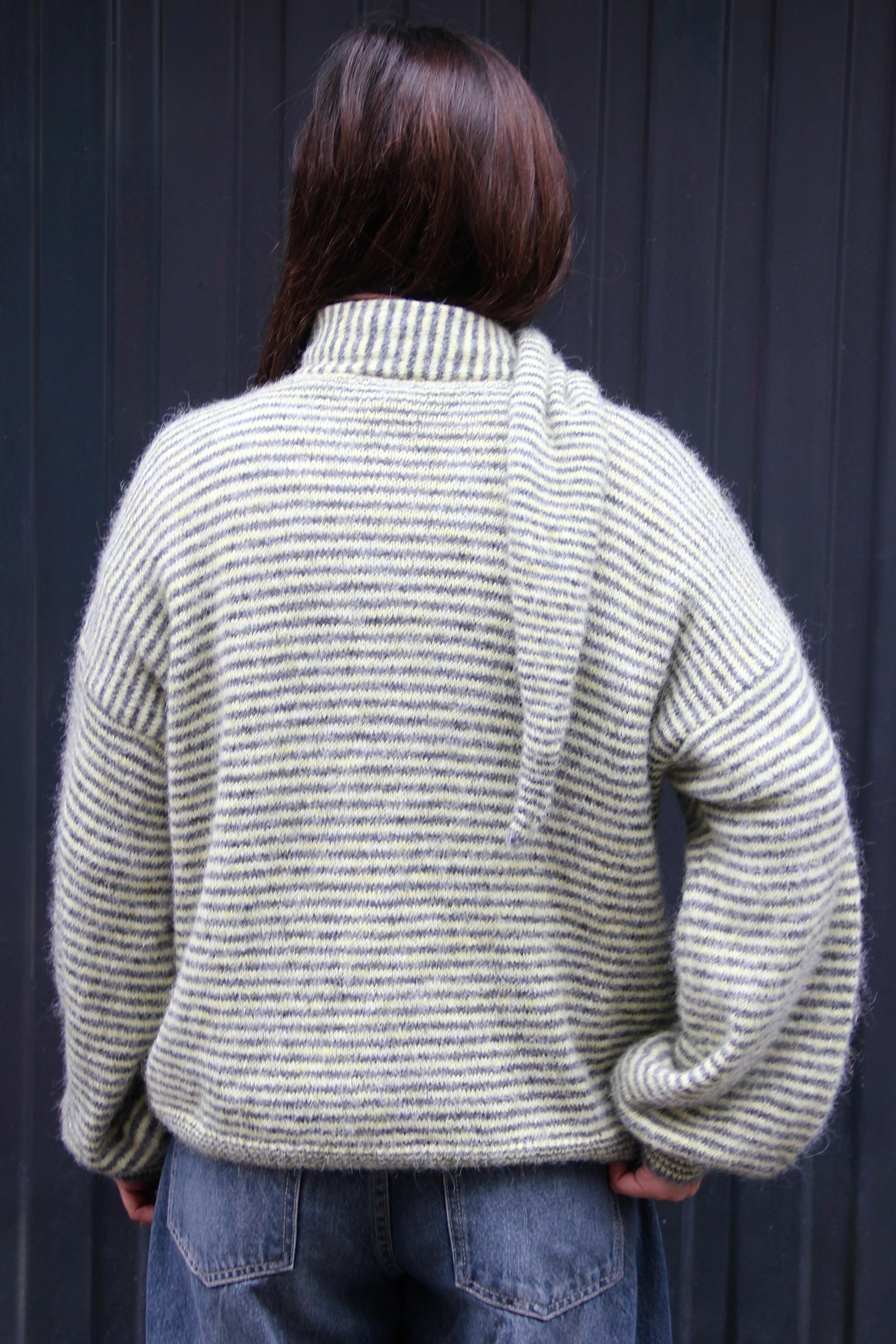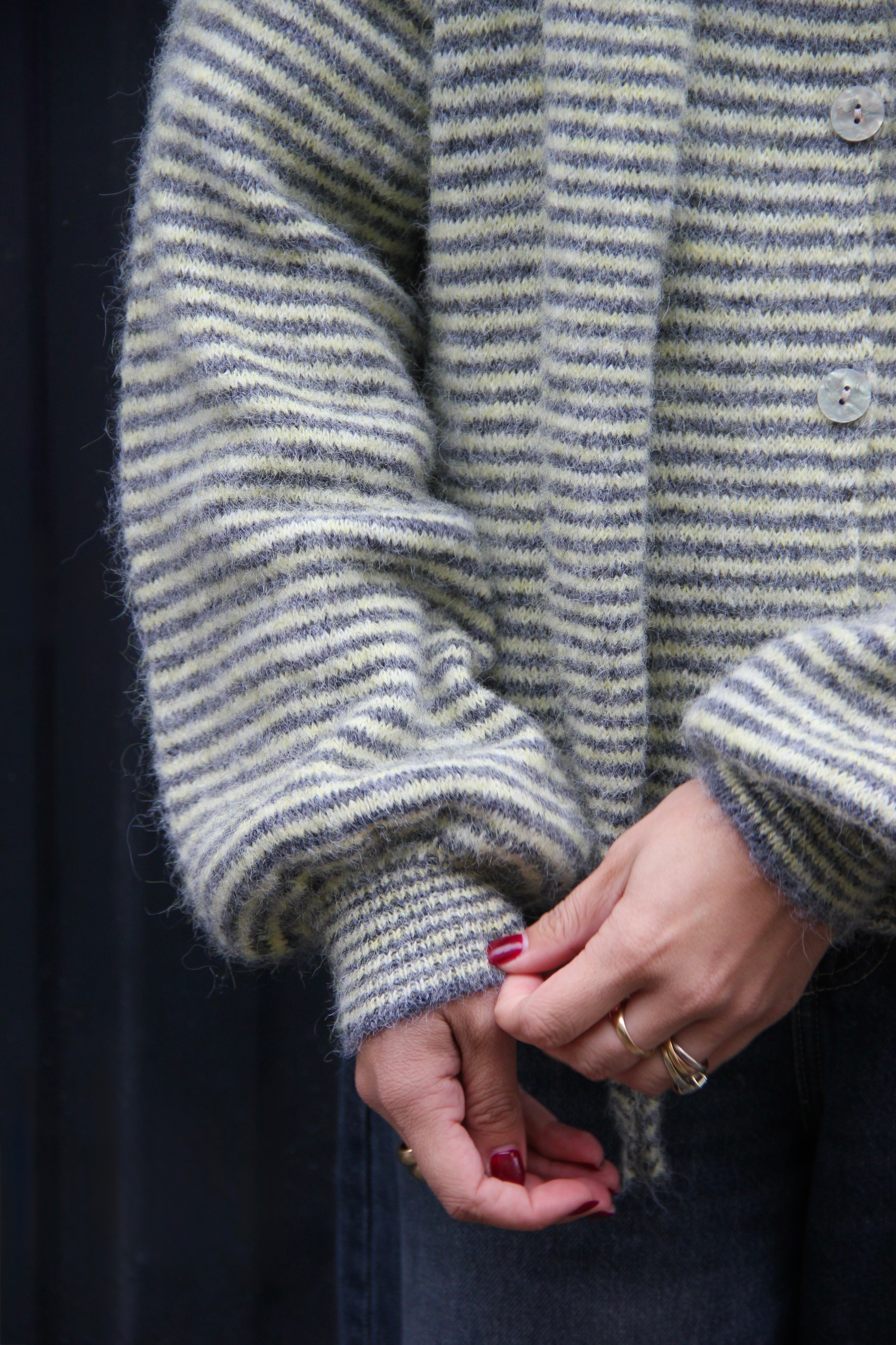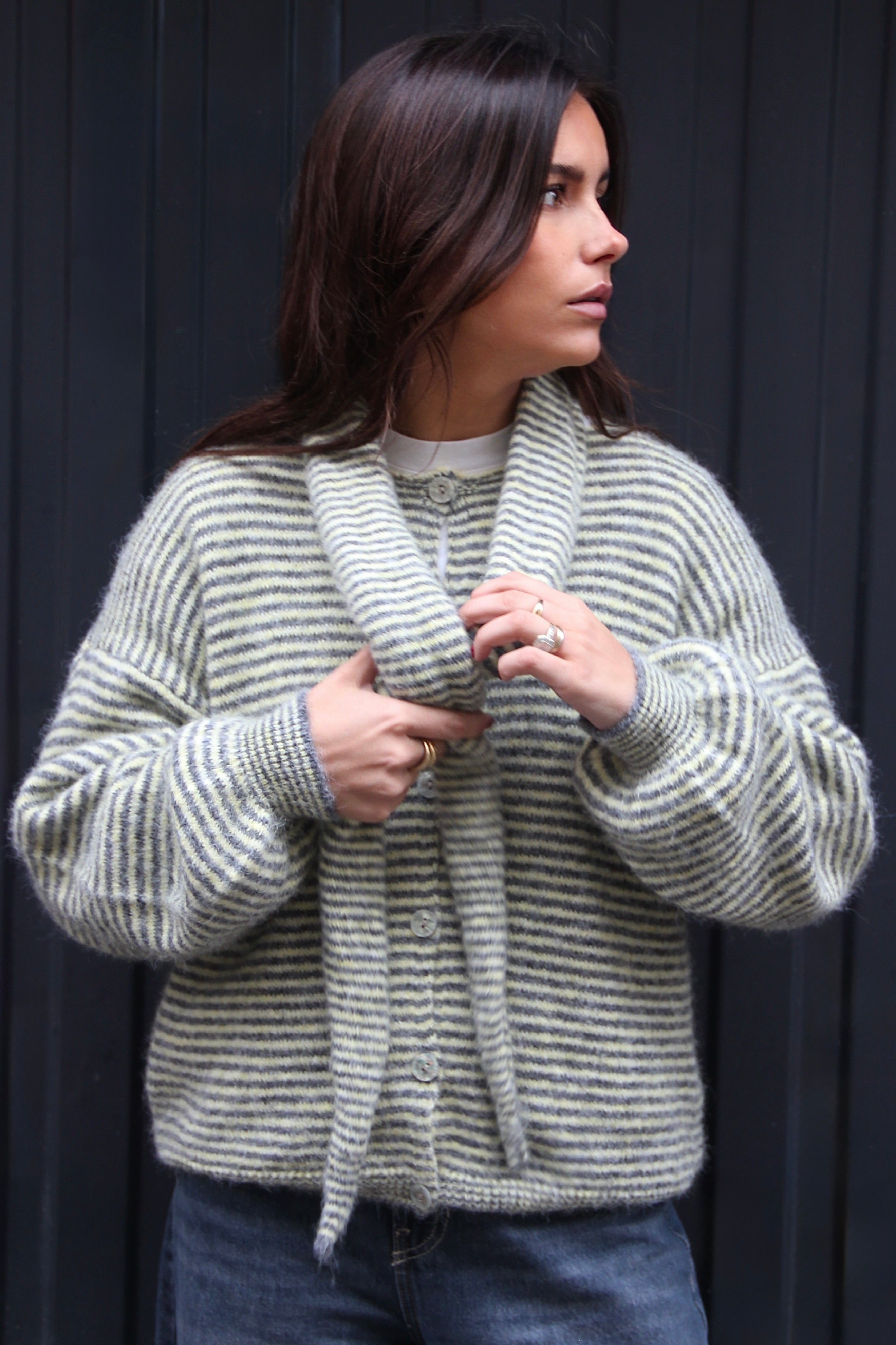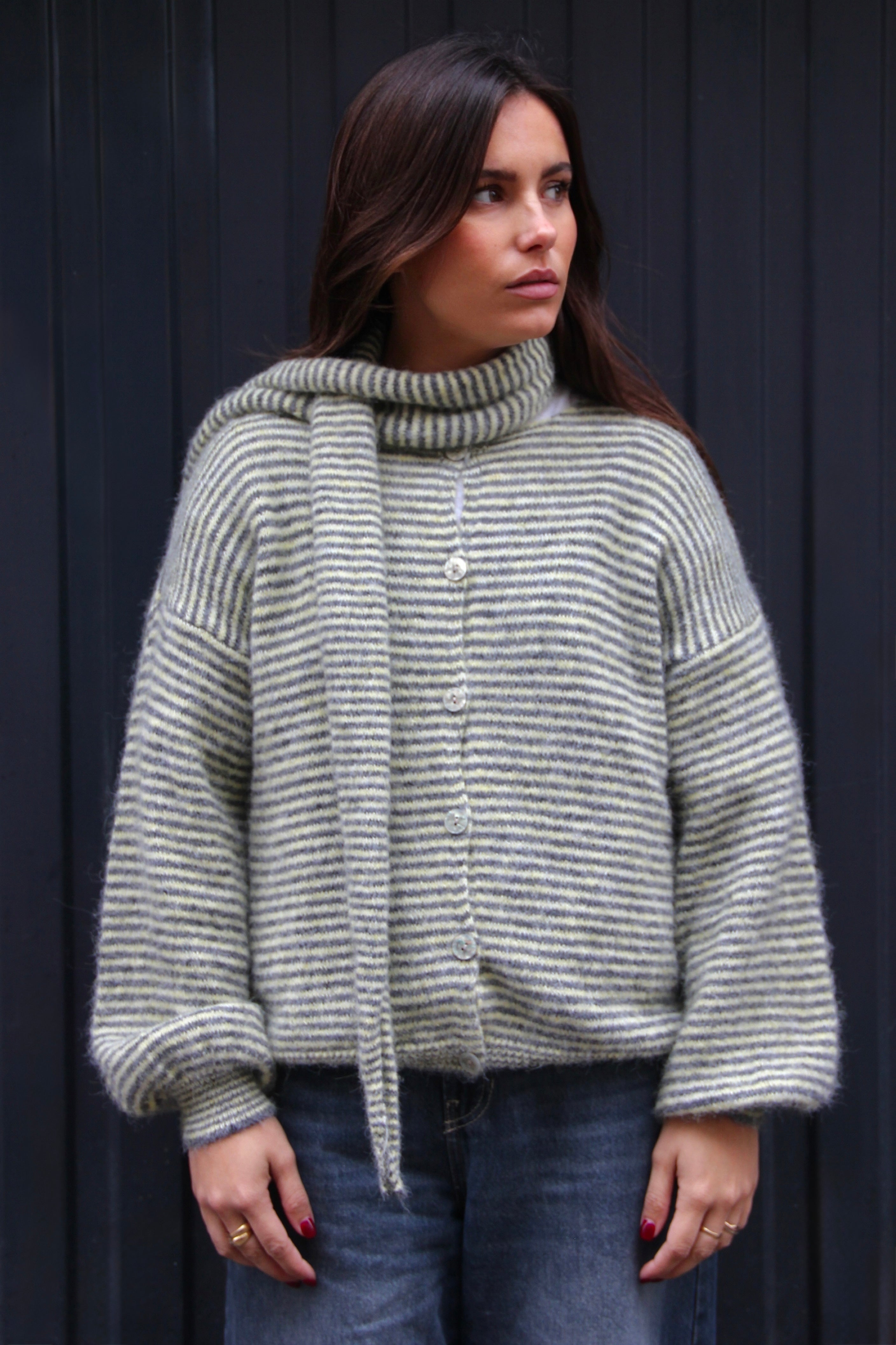 Ce cardigan à rayures jaunes et grises séduit par sa maille douce et son volume légèrement ample. Il est accompagné d’une écharpe assortie indépendante et amovible, permettant d’adapter le look selon les envies. Ses boutons contrastés ajoutent une touche élégante, faisant de ce modèle une pièce polyvalente et raffinée pour le quotidien. Taille unique. Le mannequin mesure 1m65.