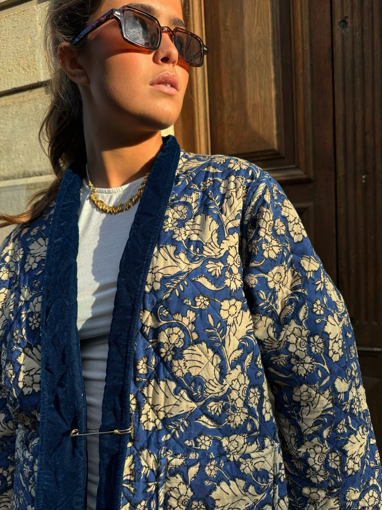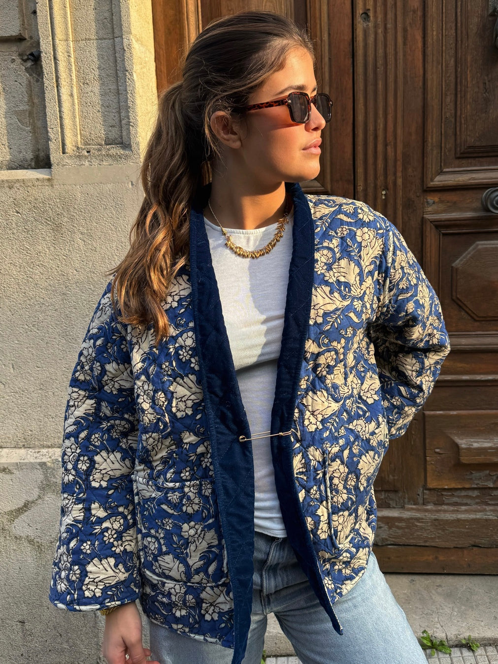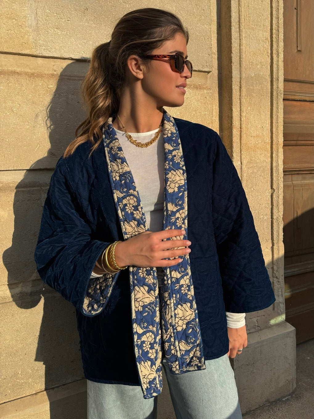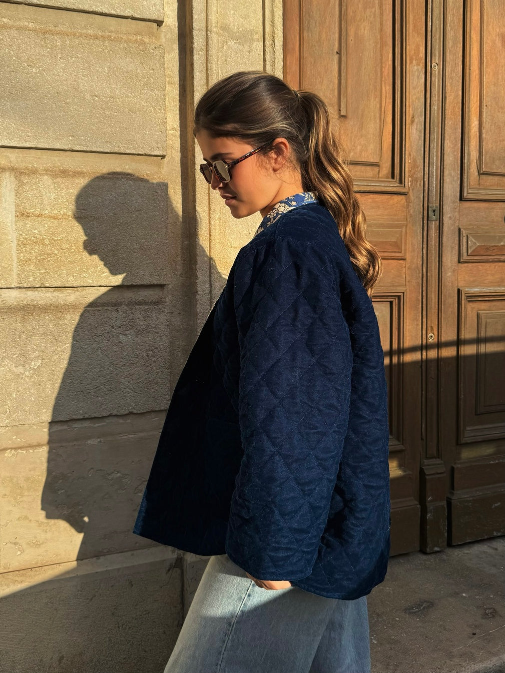 Veste bleu marine réversible 100% coton. Un côté en velours doux et élégant, l’autre avec des motifs pour un style plus casual. Coupe confortable, parfaite pour alterner entre chic et décontracté. Convient du S au L. Taille S/M portée par un mannequin de 1m65.