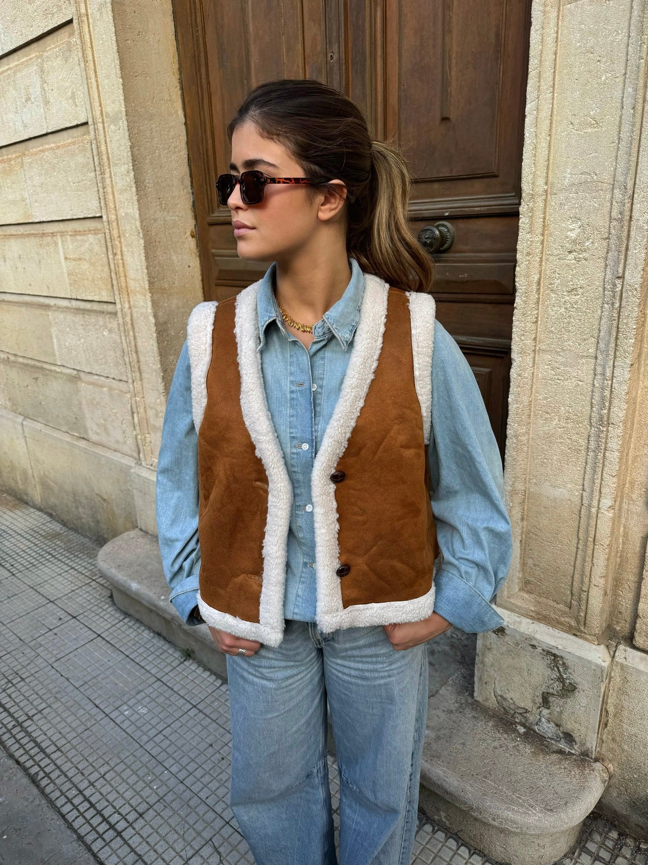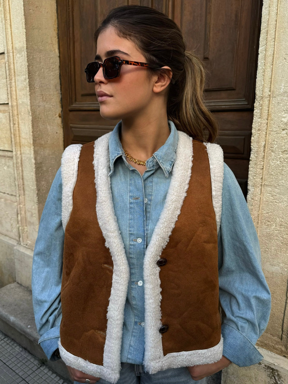 Cette veste camel allie style et confort avec son intérieur en molleton blanc visible sur les bords et les épaules. Sa coupe décontractée et sa fermeture avec boutons vintage apportent une touche d’élégance rétro. Confectionnée en 100% polyester, elle est légère et agréable à porter. Le mannequin mesure 1m65 et porte une taille 1.