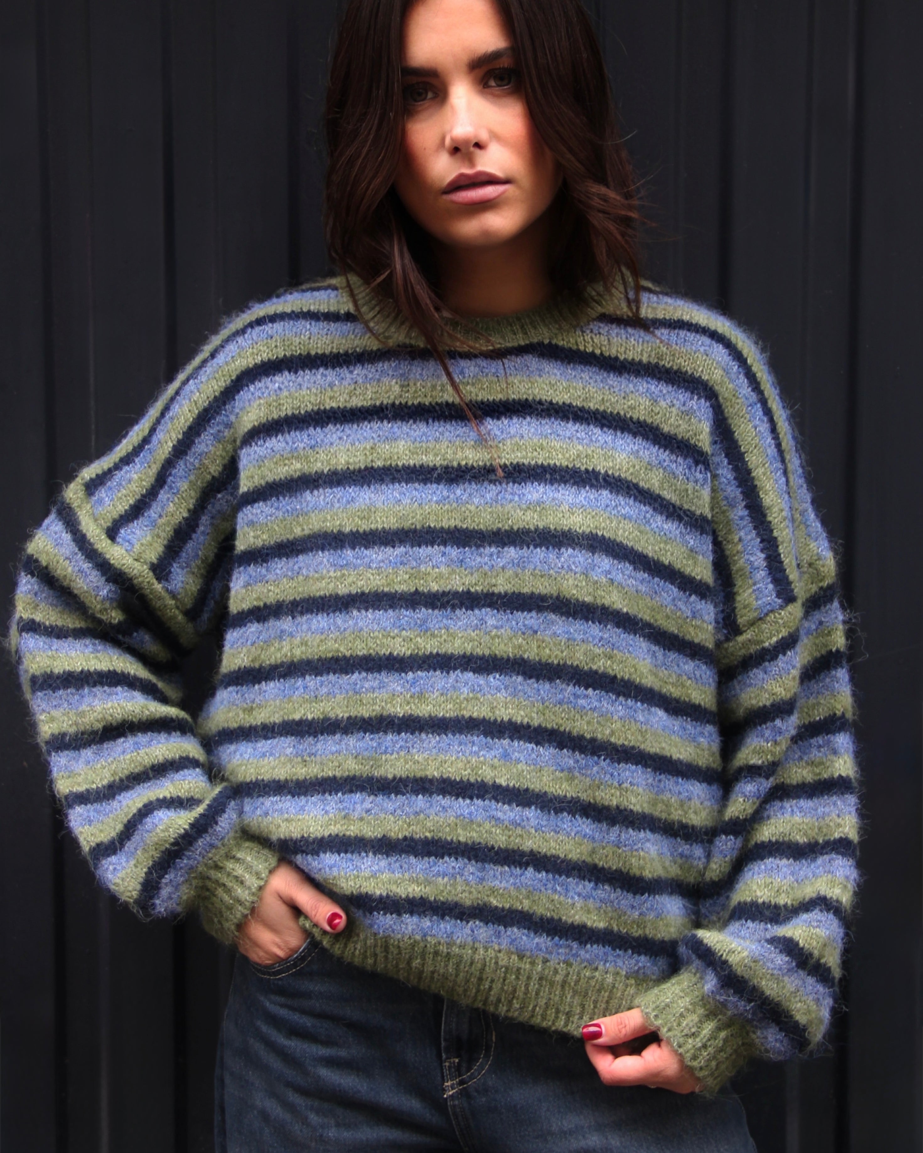 Marinière à manches longues à rayures fines bleues sur fond marron, offrant une coupe droite et un tombé fluide. Taille unique. Le mannequin mesure 1m63.
