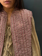Veste sans manches à imprimé vichy rose et marron, à la coupe droite et légèrement matelassée pour un style vintage et intemporel.