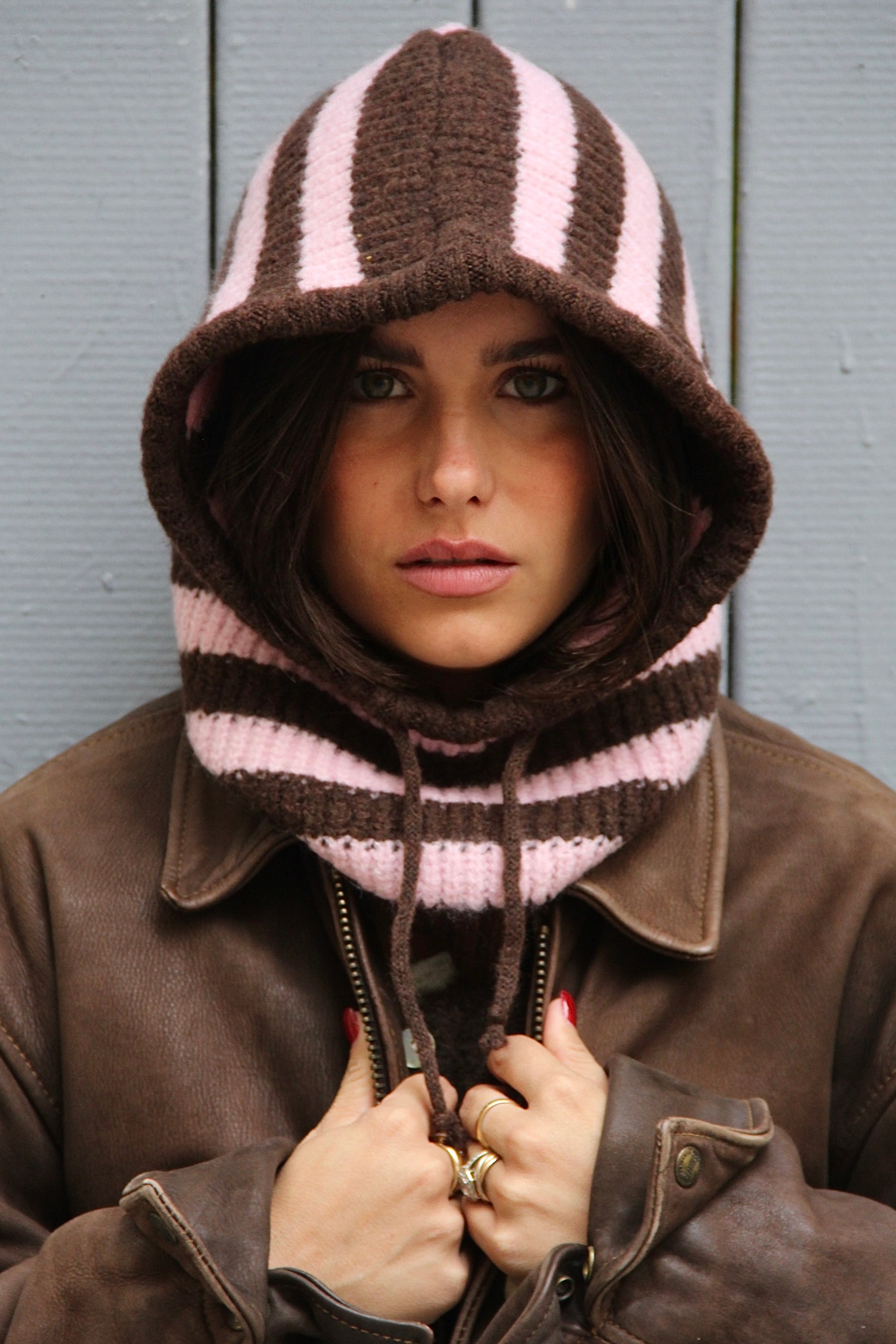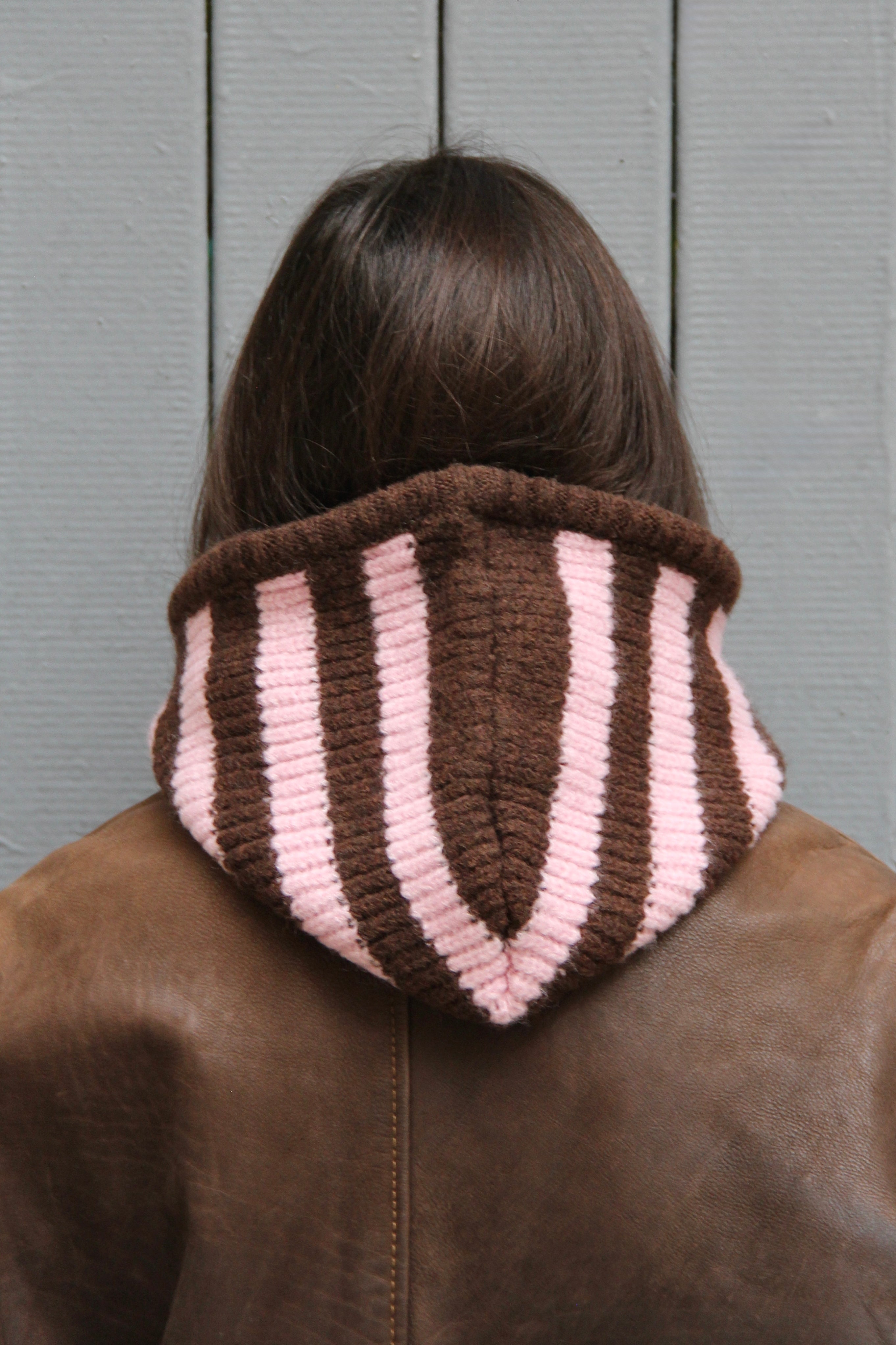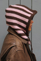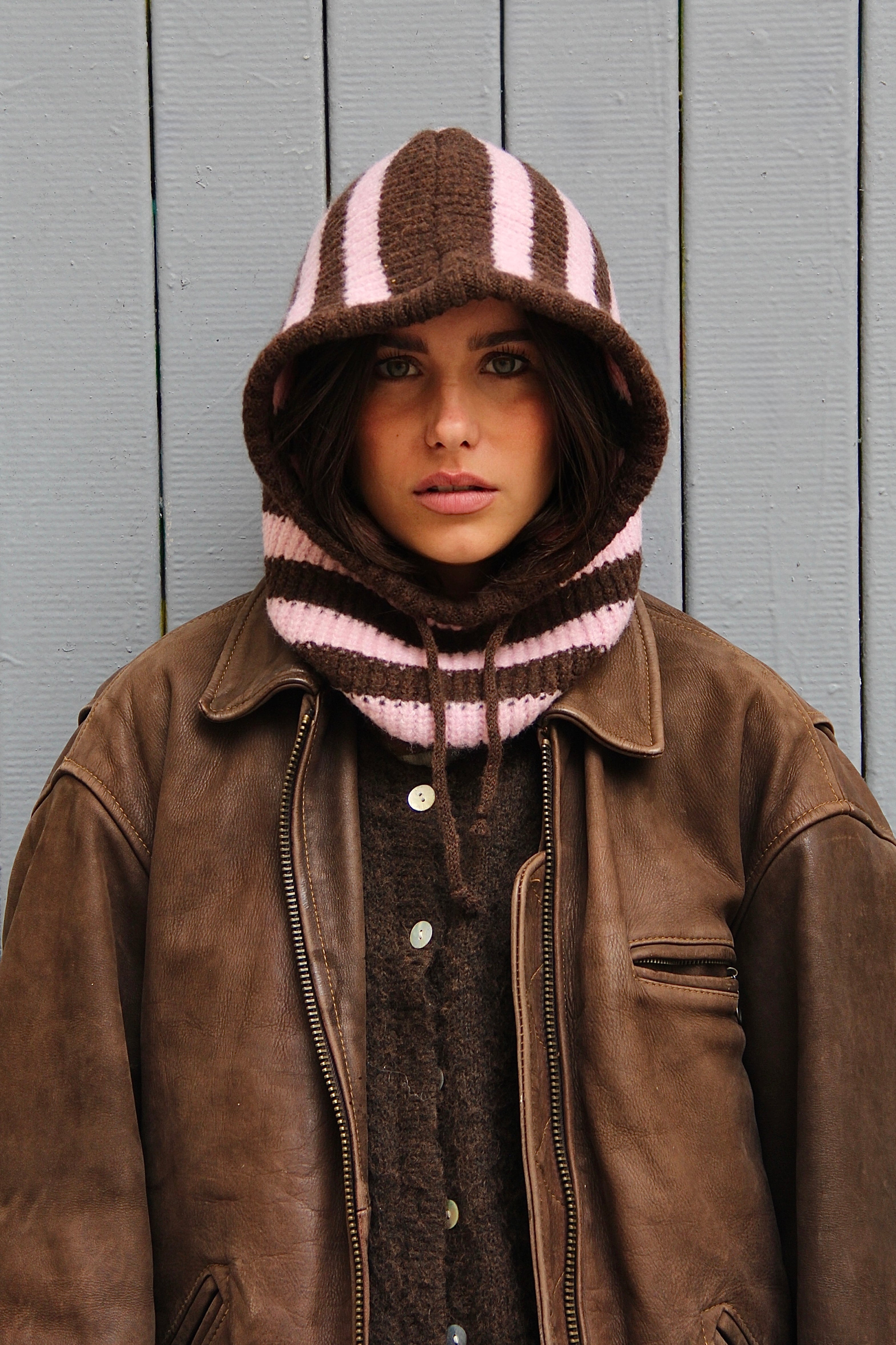 Cagoule rayée alliant confort et élégance. Son tricot rose et marron offre une protection optimale contre le froid, avec des cordons de serrage pour un ajustement parfait.