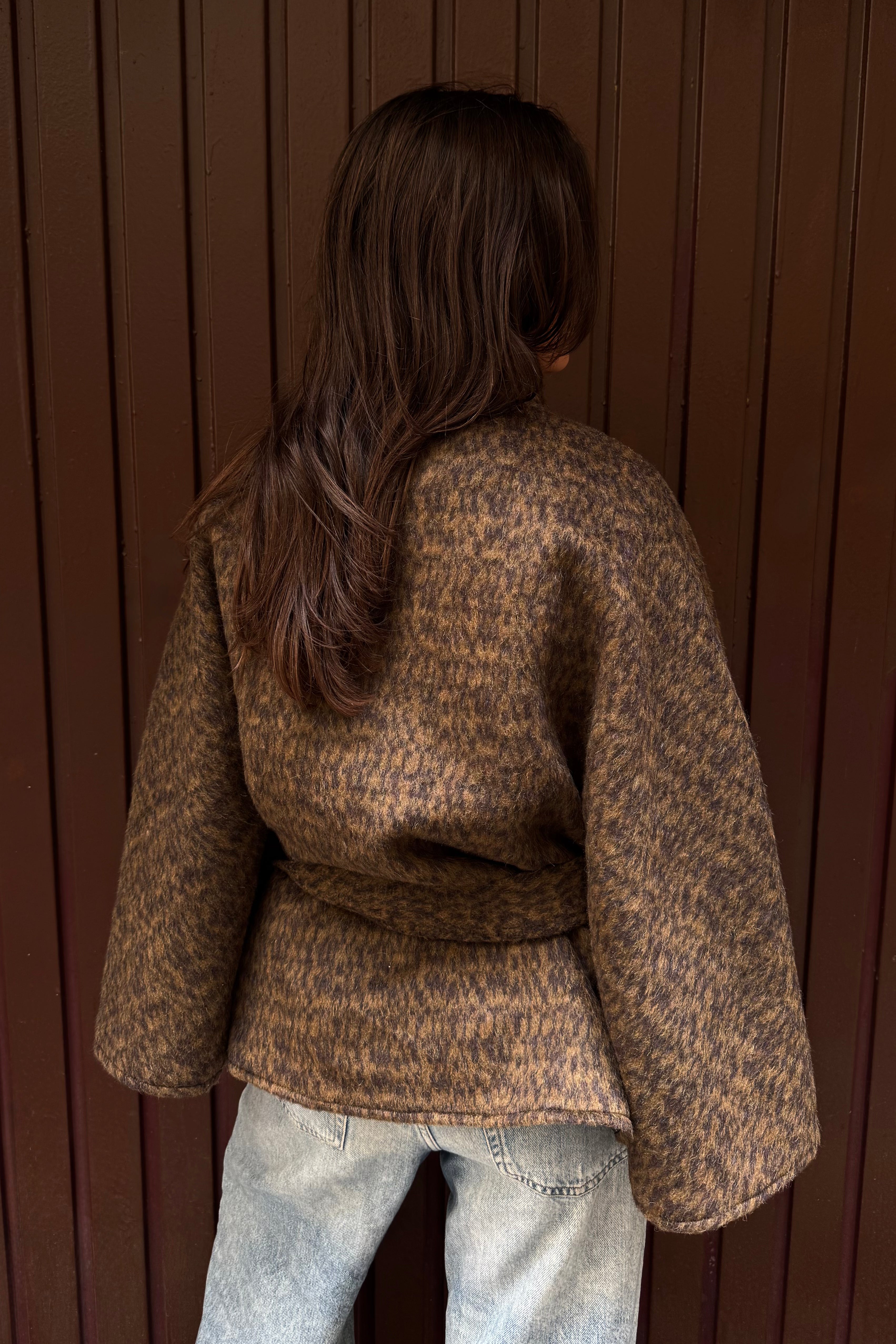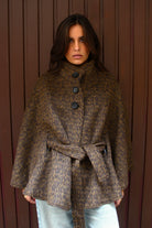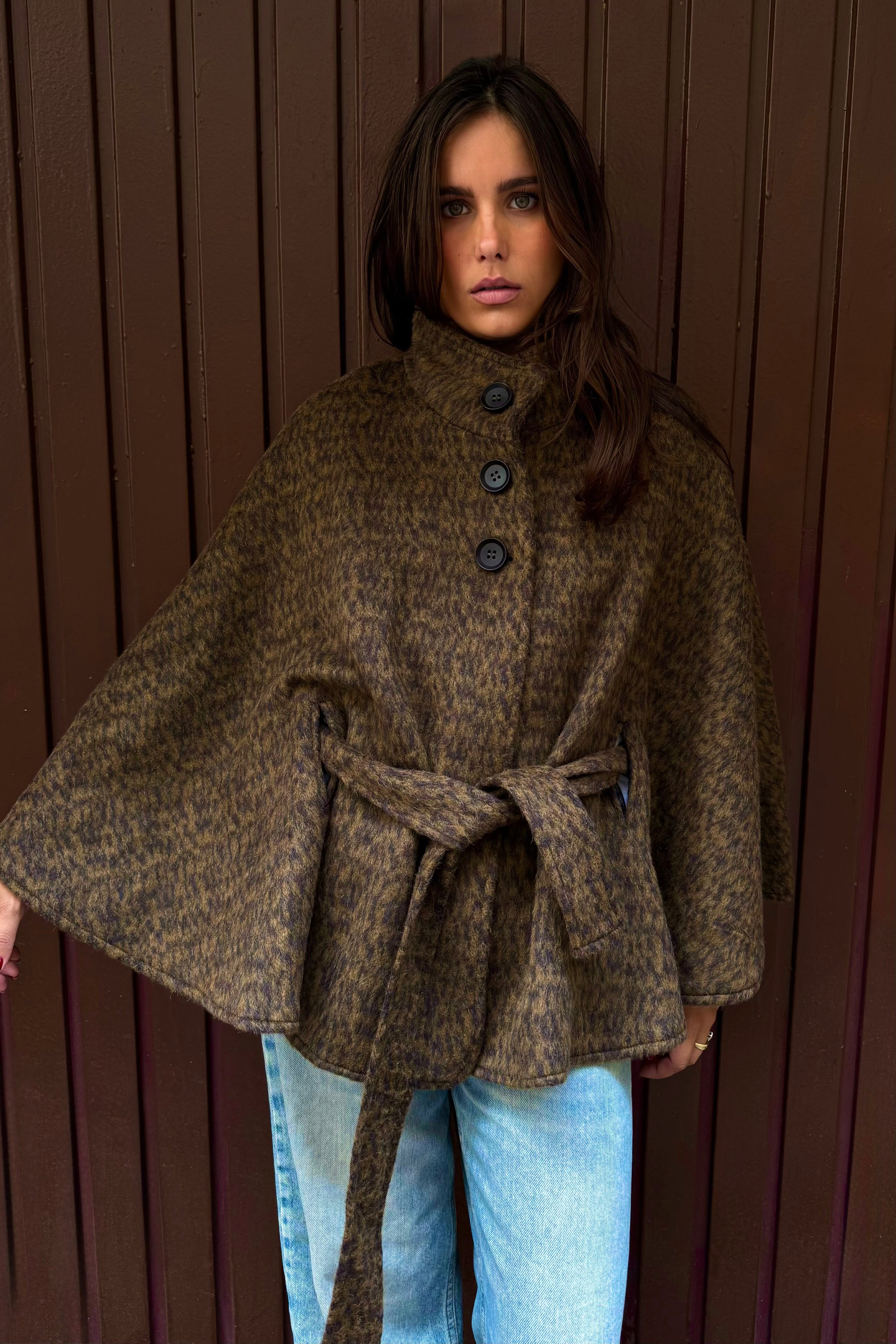 Cape femme en deux tons de marron, fermée par trois grands boutons contrastés. Col montant élégant et ceinture assortie à nouer à la taille pour mettre en valeur la silhouette. Une pièce chaude et stylée, parfaite pour la mi-saison comme l’hiver. 90% polyester, 10% laine. Le mannequin mesure 1m65.