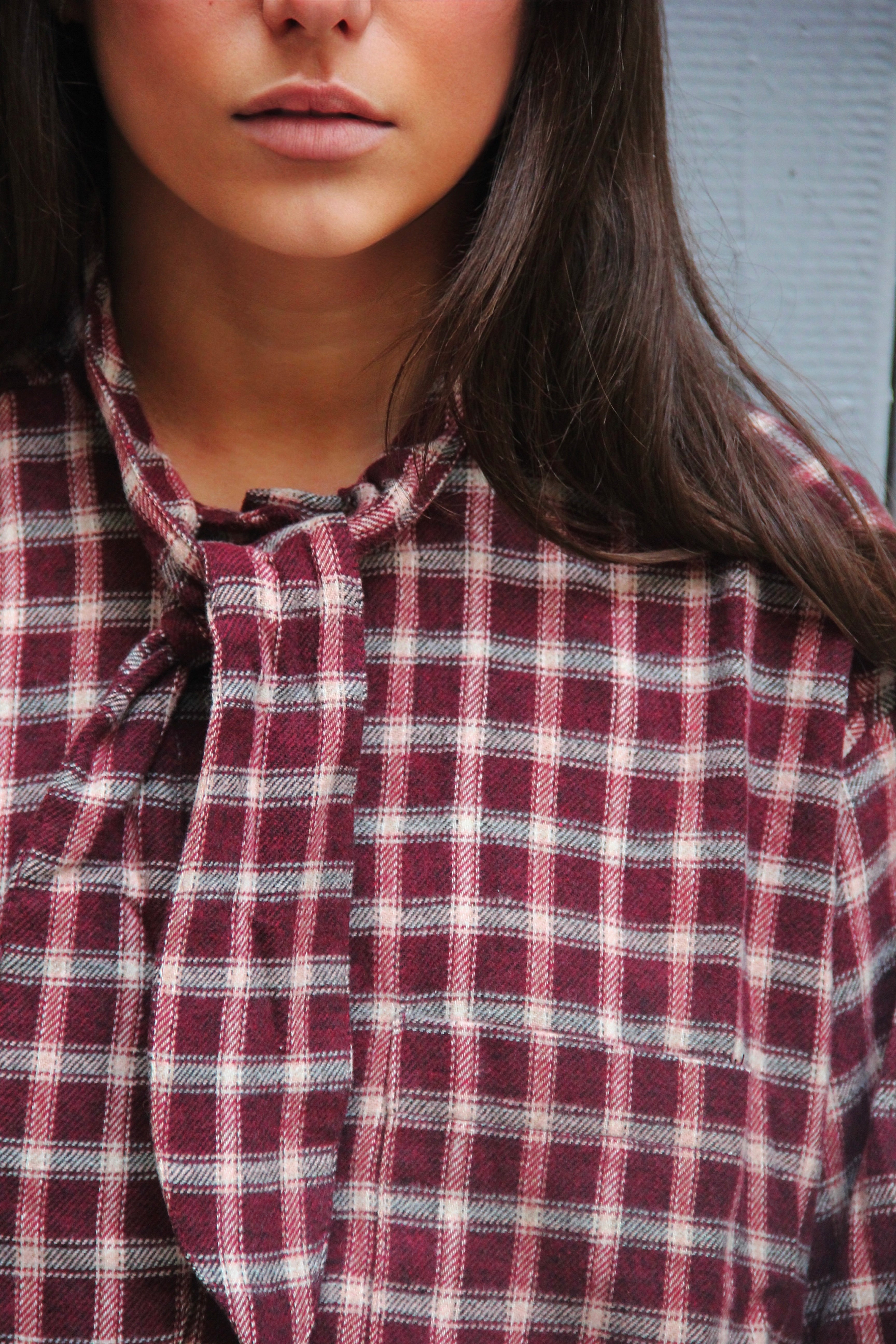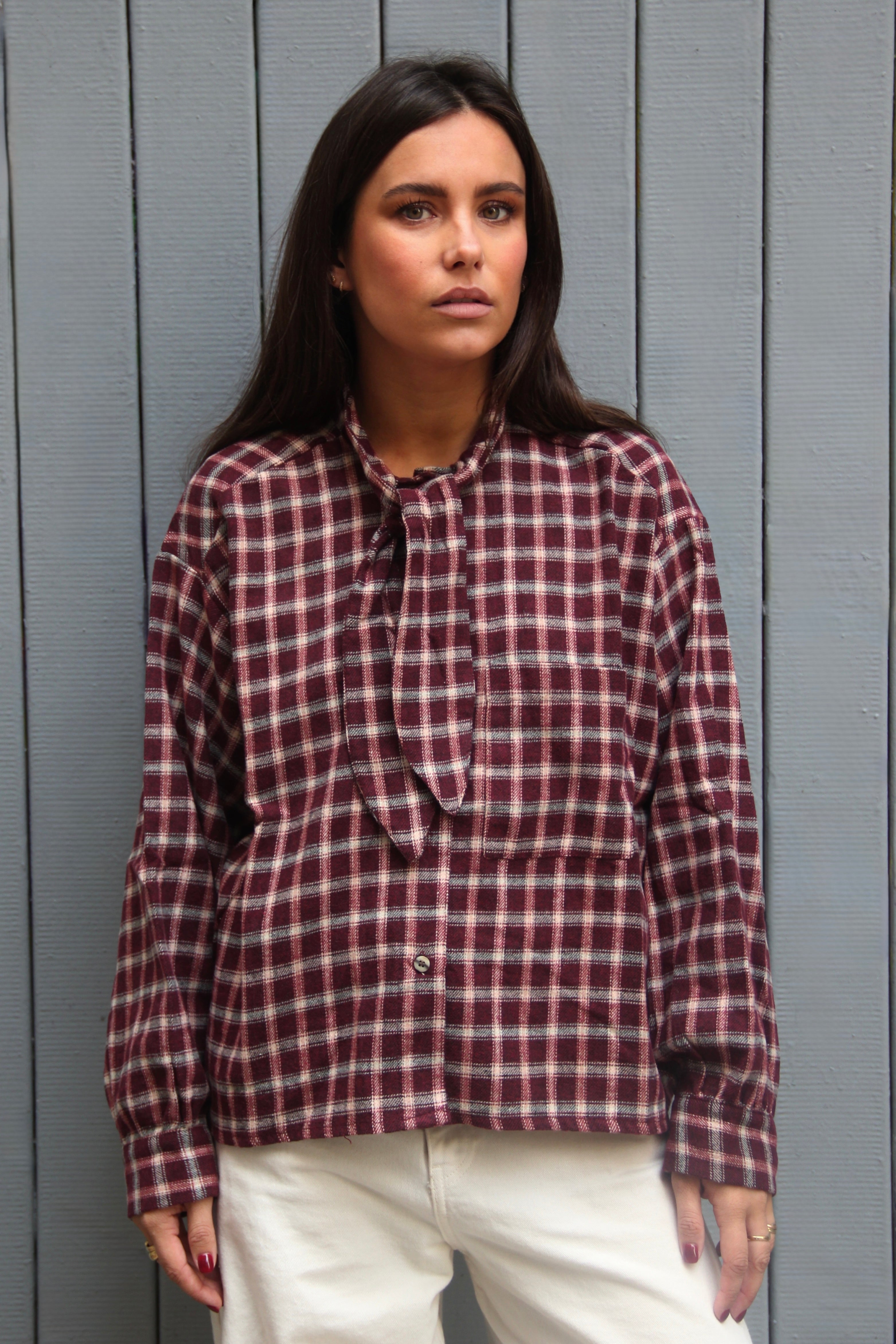 Chemise à carreaux épaisse et douce, au tomber fluide. Détail lavallière pour un style à la fois élégant et casual. Taille unique. Le mannequin mesure 1m63.