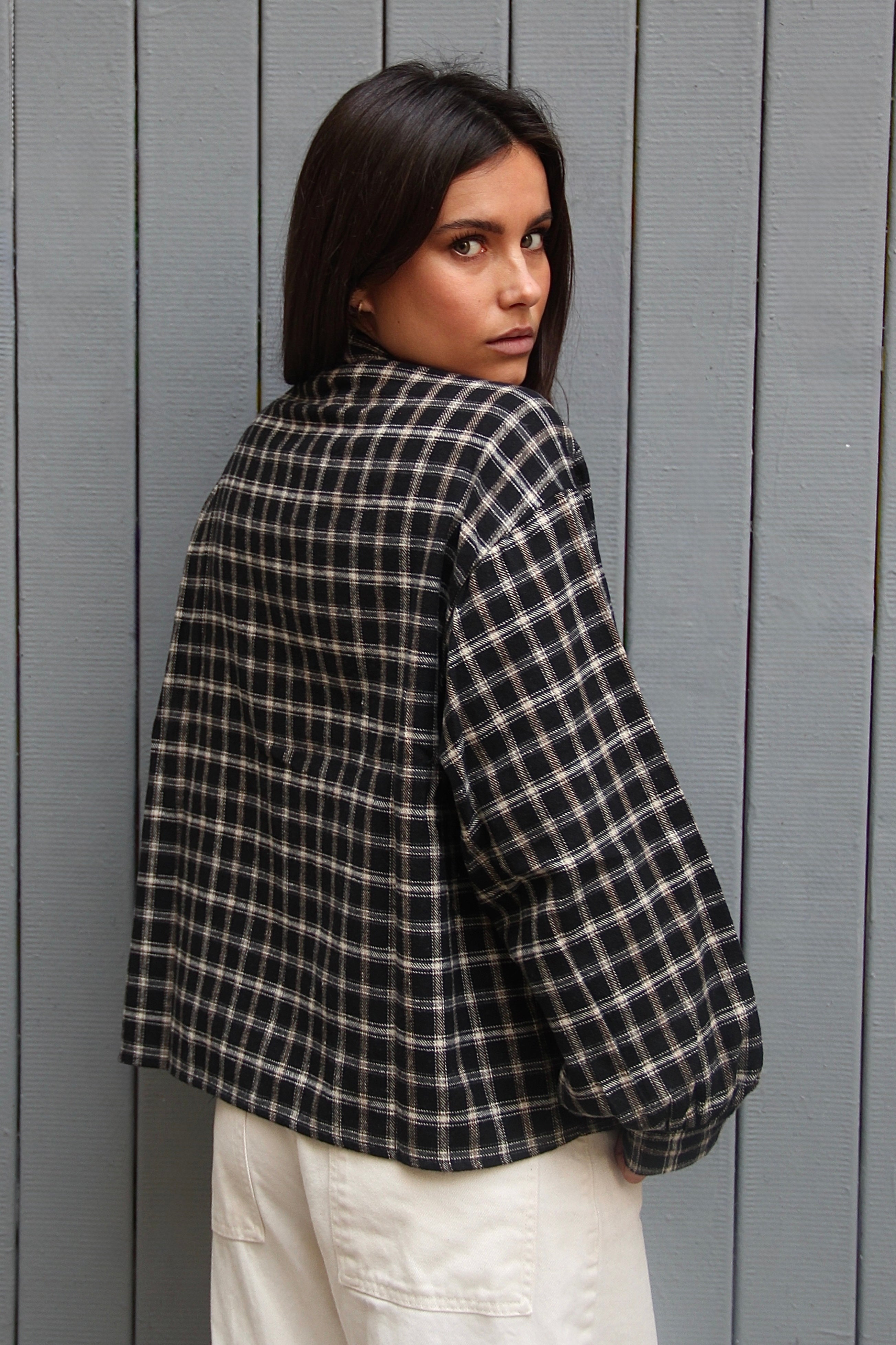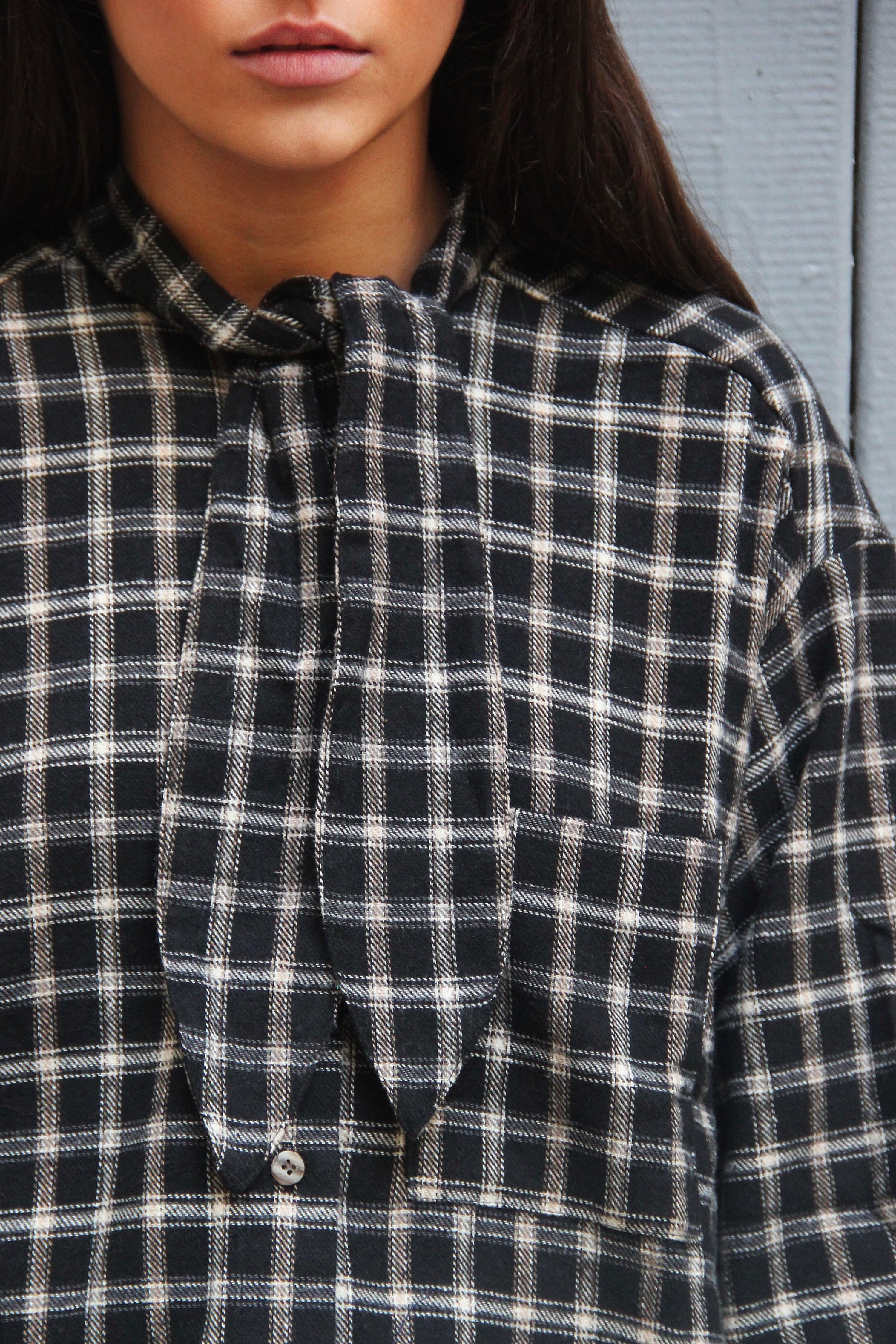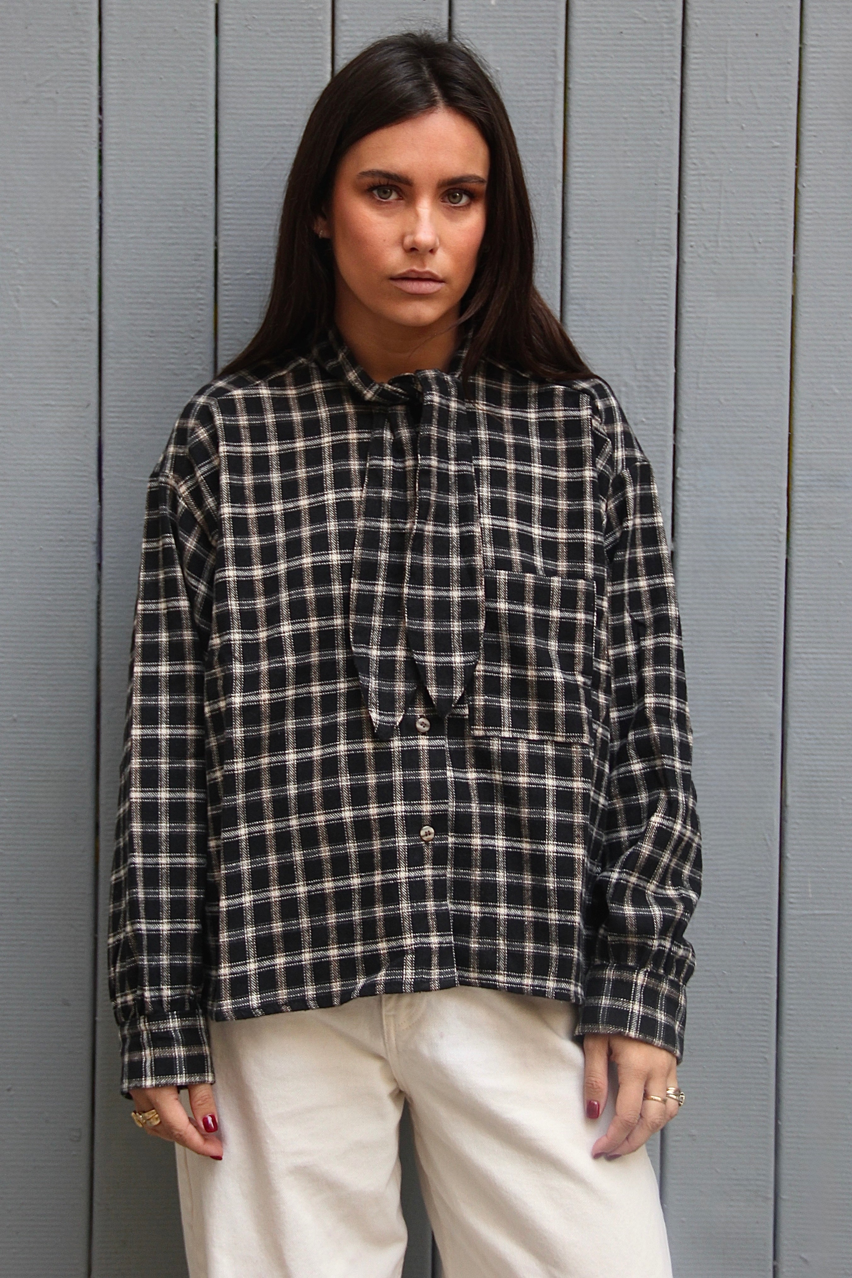Chemise à carreaux épaisse et douce, au tomber fluide. Détail lavallière pour un style à la fois élégant et casual. Taille unique. Le mannequin mesure 1m63.
