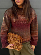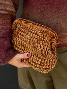 Pochette en velours effet brun caramel, au tissage dense et texturé. Sa forme souple et son toucher doux lui confèrent une allure élégante et contemporaine, parfaite pour sublimer une tenue automnale. Une bandoulière est fournie, offrant un porté épaule ou croisé.