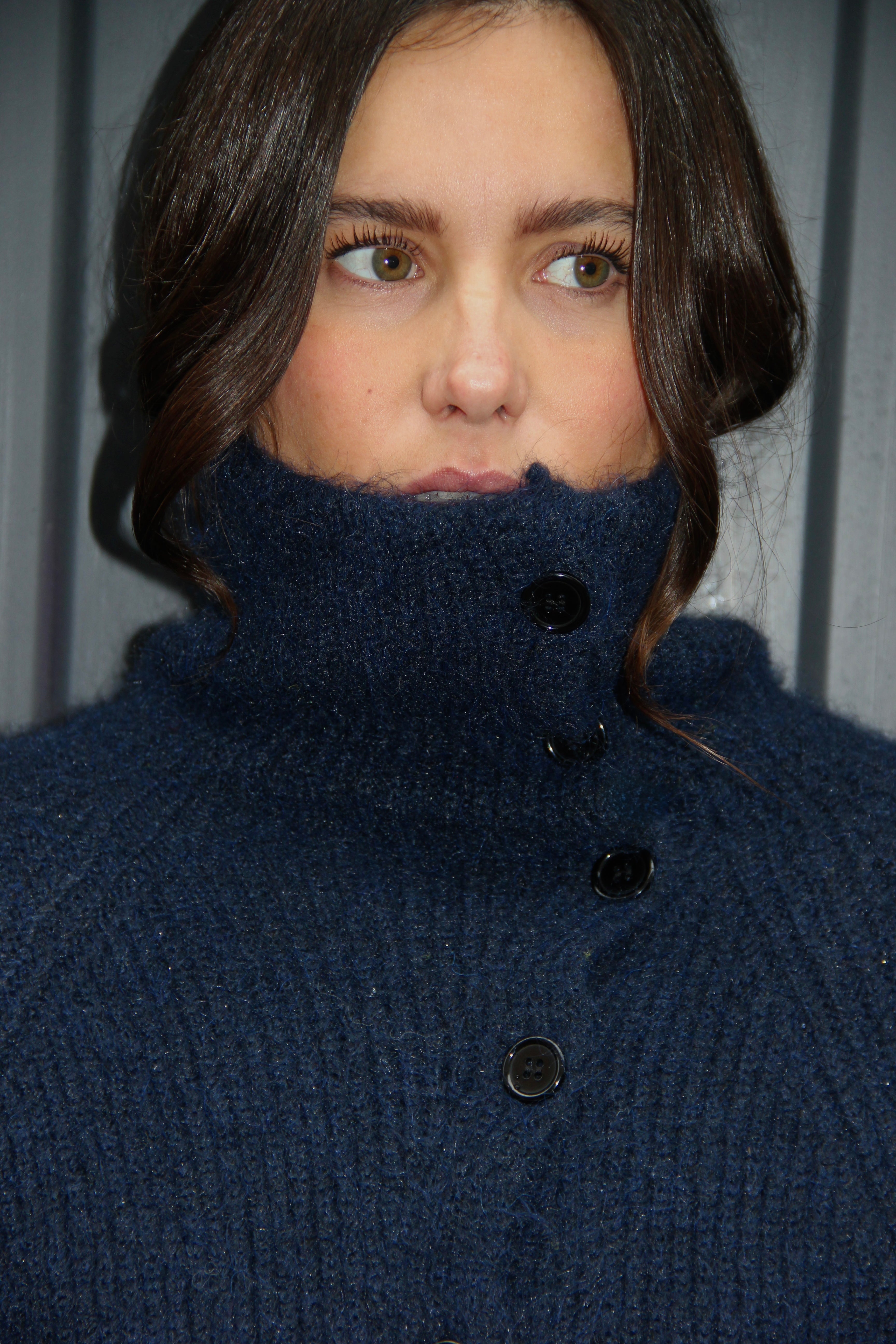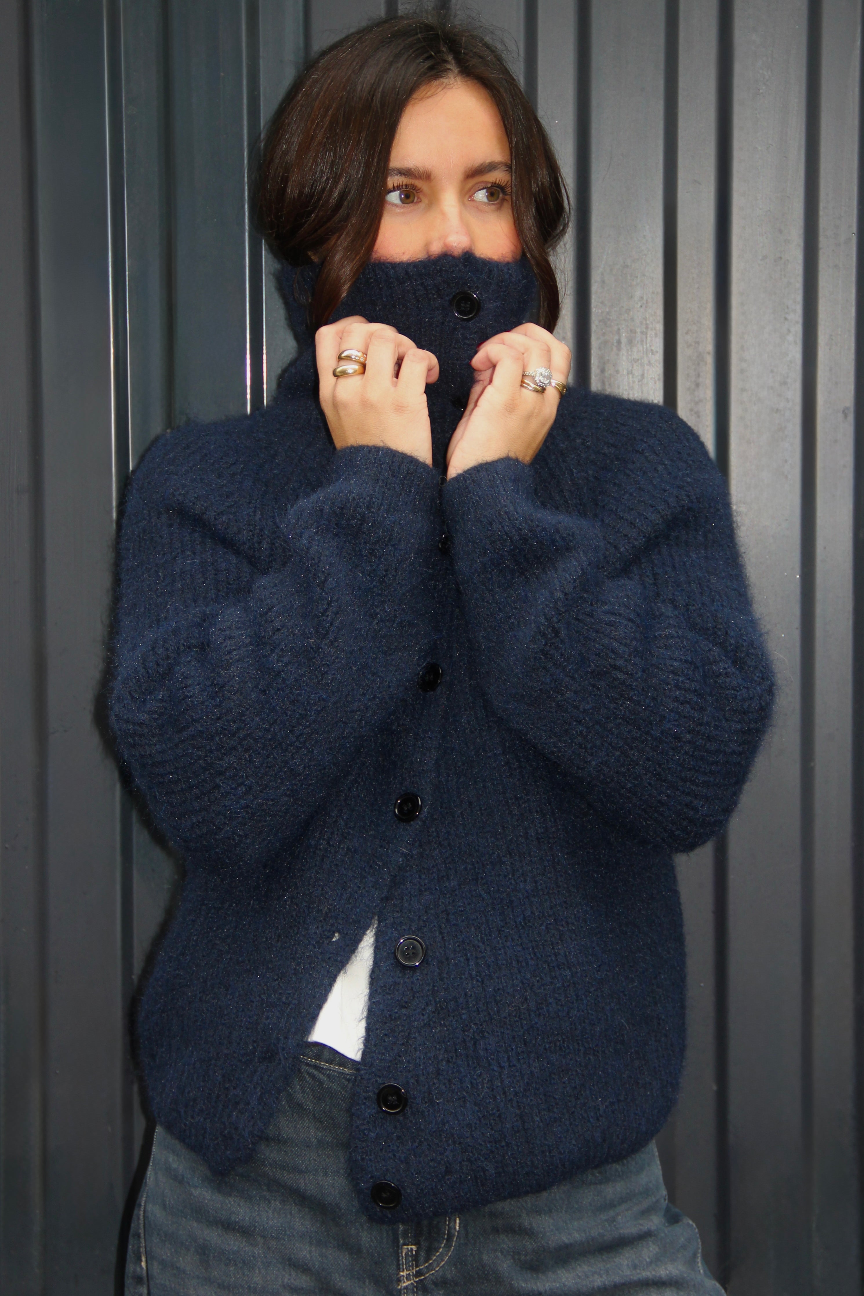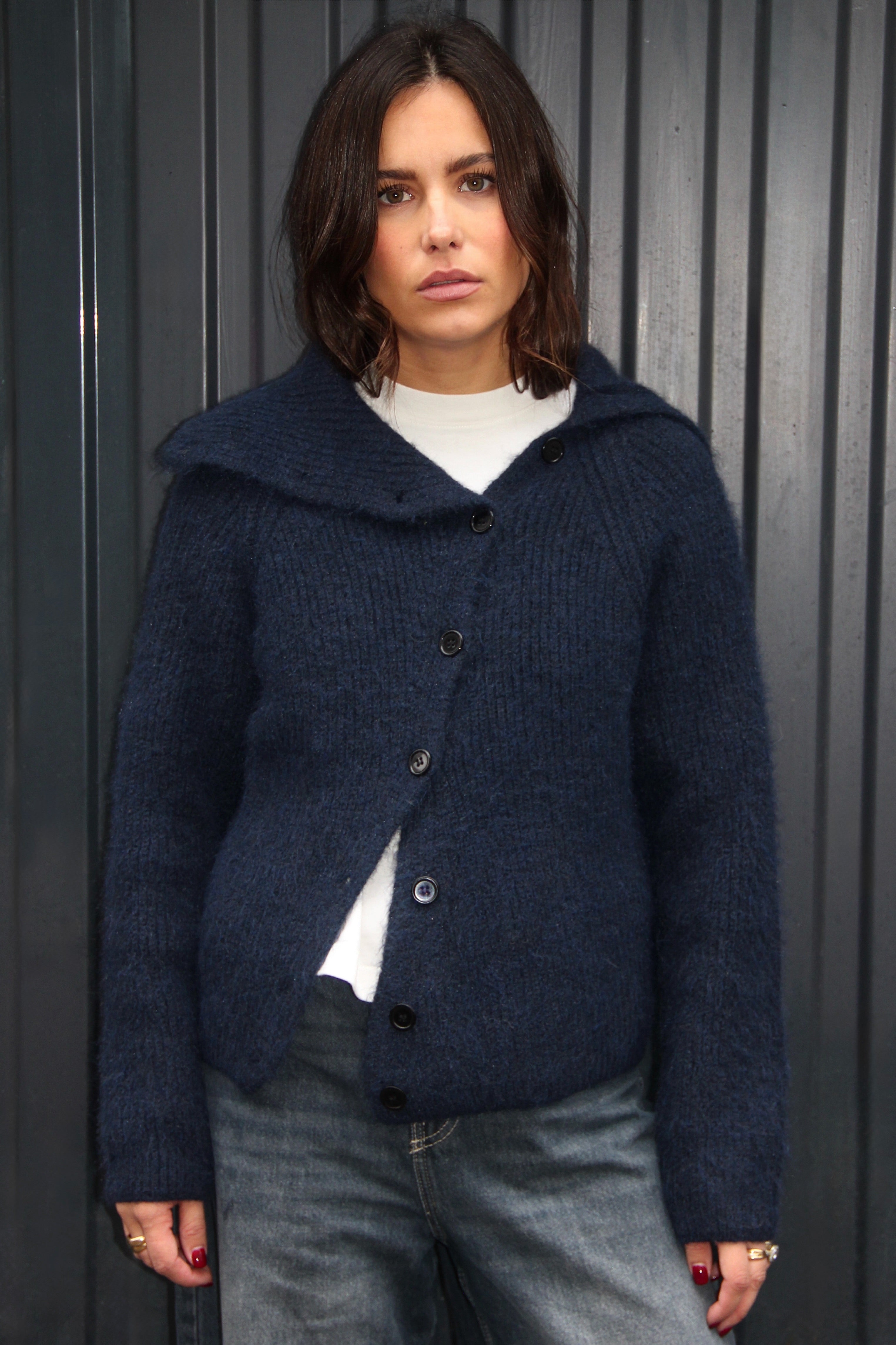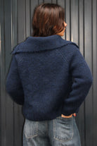 Pull cardigan bleu marine en maille épaisse, doté d’une coupe décontractée et d’un large col côtelé. Sa fermeture boutonnée est asymétrique. Un essentiel chaud et stylé pour la mi-saison comme pour l’hiver. Taille unique. Le mannequin mesure 1m65.