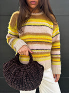 Ce sac, réalisé à partir d’une pelote de velours, séduit par sa texture douce et son look unique. Sa couleur chocolat lui donne une allure chaleureuse et élégante. Pratique, il dispose d’une bandoulière assortie à l’intérieur, pour se porter aussi bien à la main qu’à l’épaule.