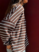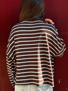 Marinière à manches longues à rayures fines bleues sur fond marron, offrant une coupe droite et un tombé fluide. Taille unique. Le mannequin mesure 1m63.