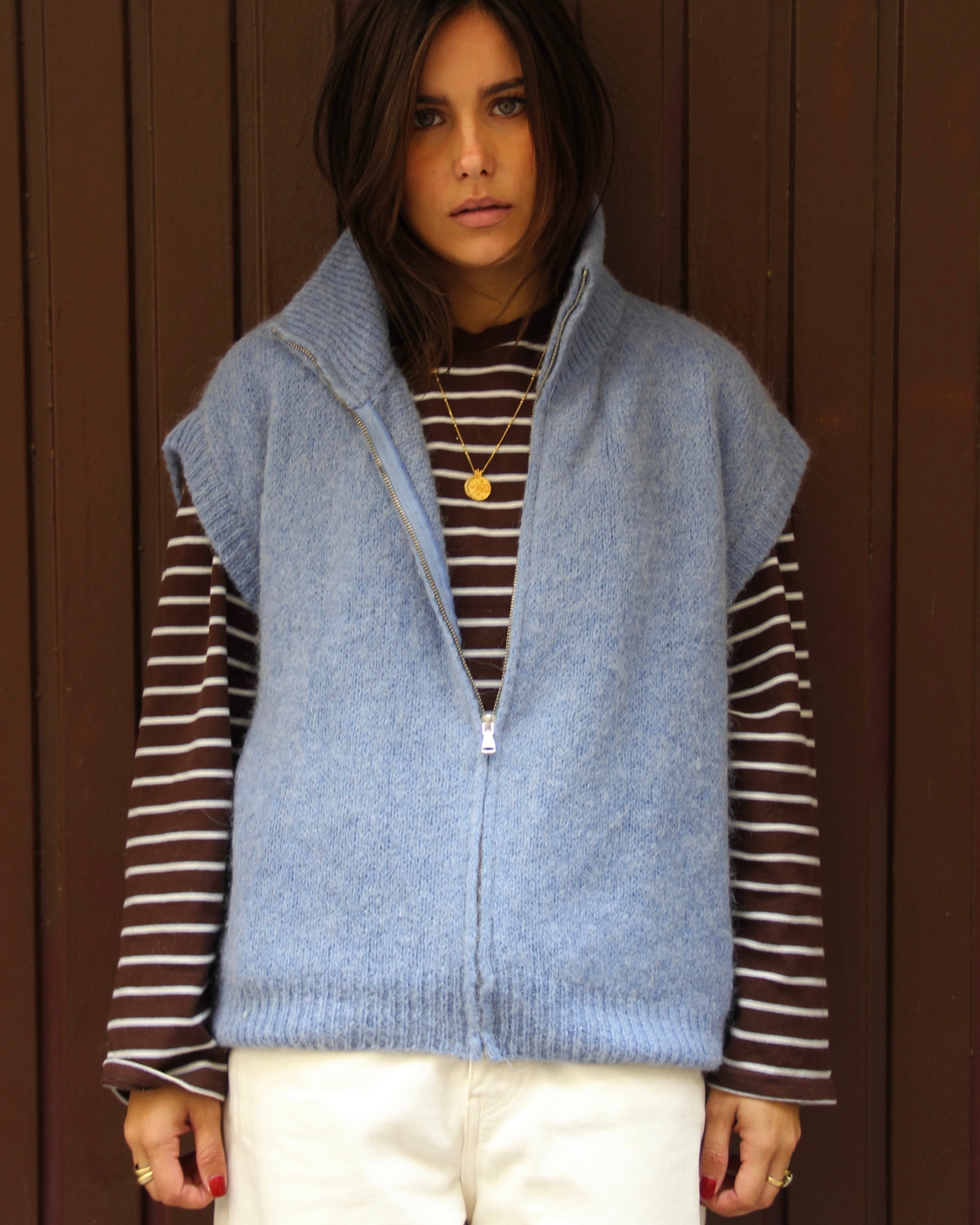 Veste sans manches à imprimé vichy marron et beige, à la coupe droite et légèrement matelassée pour un style vintage et intemporel.